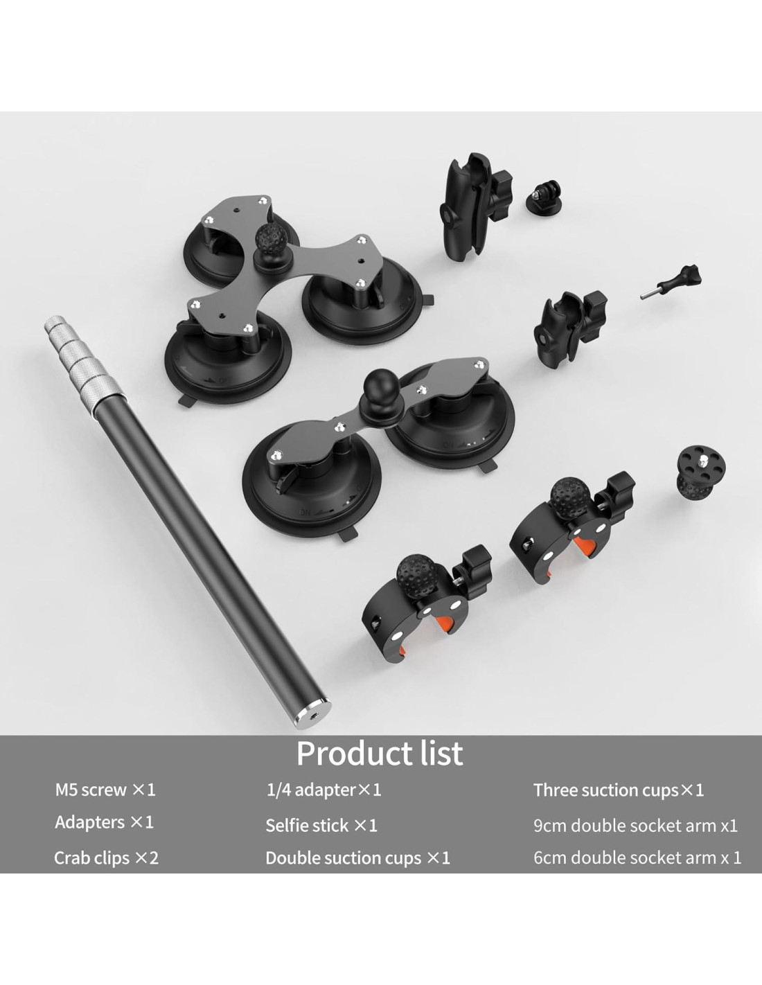 Este kit versátil te permite capturar impresionantes imágenes a baja altitud sin un dron, perfecto para vlogs dinámicos, videos de conducción y contenido de aventura. La adsorción rápida y fuerte se logra al presionar, con una línea indicadora para ayudar en la posición, y una liberación rápida al tirar suavemente de los dos botones en cada ventosa. Este palo de selfie invisible mejorado es perfecto para capturar fotos y videos impresionantes sin ser visible en la toma. Muy robusto y estable, sin temblores. Nuestro soporte de cámara con ventosa permite rotar 360 fácilmente, equipado con 5 potentes ventosas de 3.3 pulgadas (8.38 cm), el soporte ofrece doble seguridad y estabilidad sólida en cualquier superficie lisa.