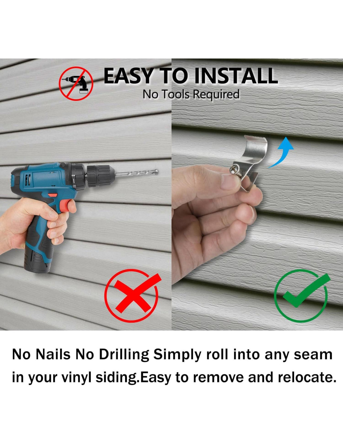 - Dos Métodos de Instalación: 1) Instalación con gancho de clip para revestimiento de vinilo, sin taladrar ni herramientas requeridas, solo inserta el gancho en cualquier costura del revestimiento de vinilo o aluminio para una posición flexible, instalación más fácil y conveniente, evita perforar agujeros o causar daños al revestimiento. 2) Con instalación de tornillo, adecuado para interiores, exteriores, paredes, techos, árboles.