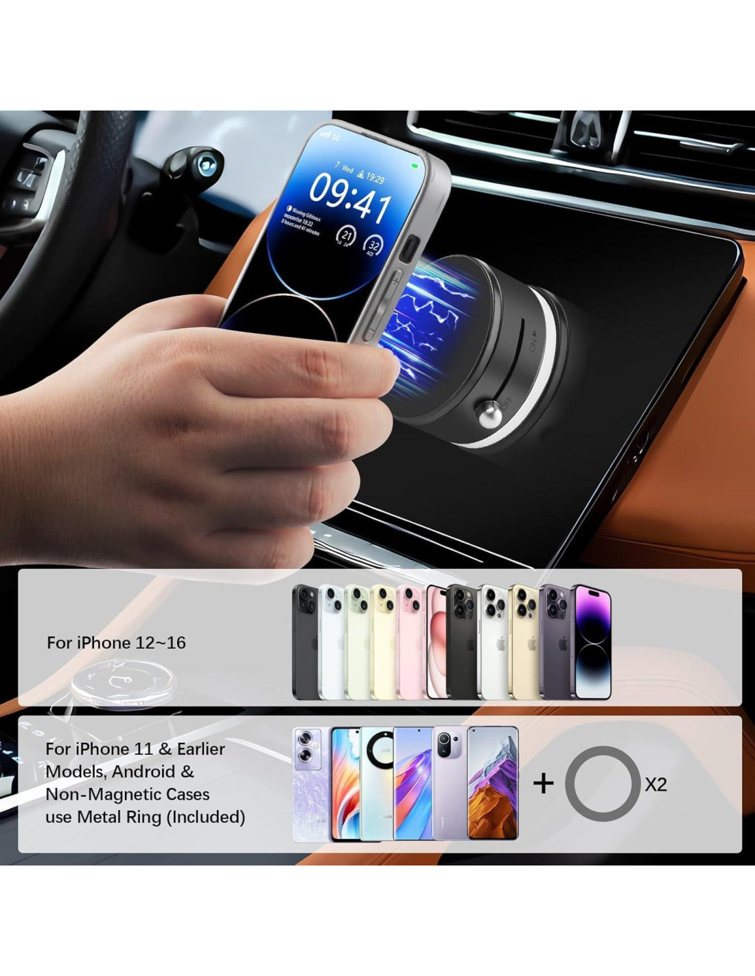 - SOPORTE UNIVERSAL PARA TELÉFONOS CELULARES - El soporte de teléfono magnético con ventosa de vacío para automóvil 2025 se puede usar directamente en iPhone 16/15/14/13/12 y series Pro Max mini. Además, ofrecemos anillos metálicos para teléfonos y fundas no magnéticas. Pega el anillo metálico en la parte posterior del teléfono o funda y déjalo reposar durante 24 horas para maximizar la adhesión