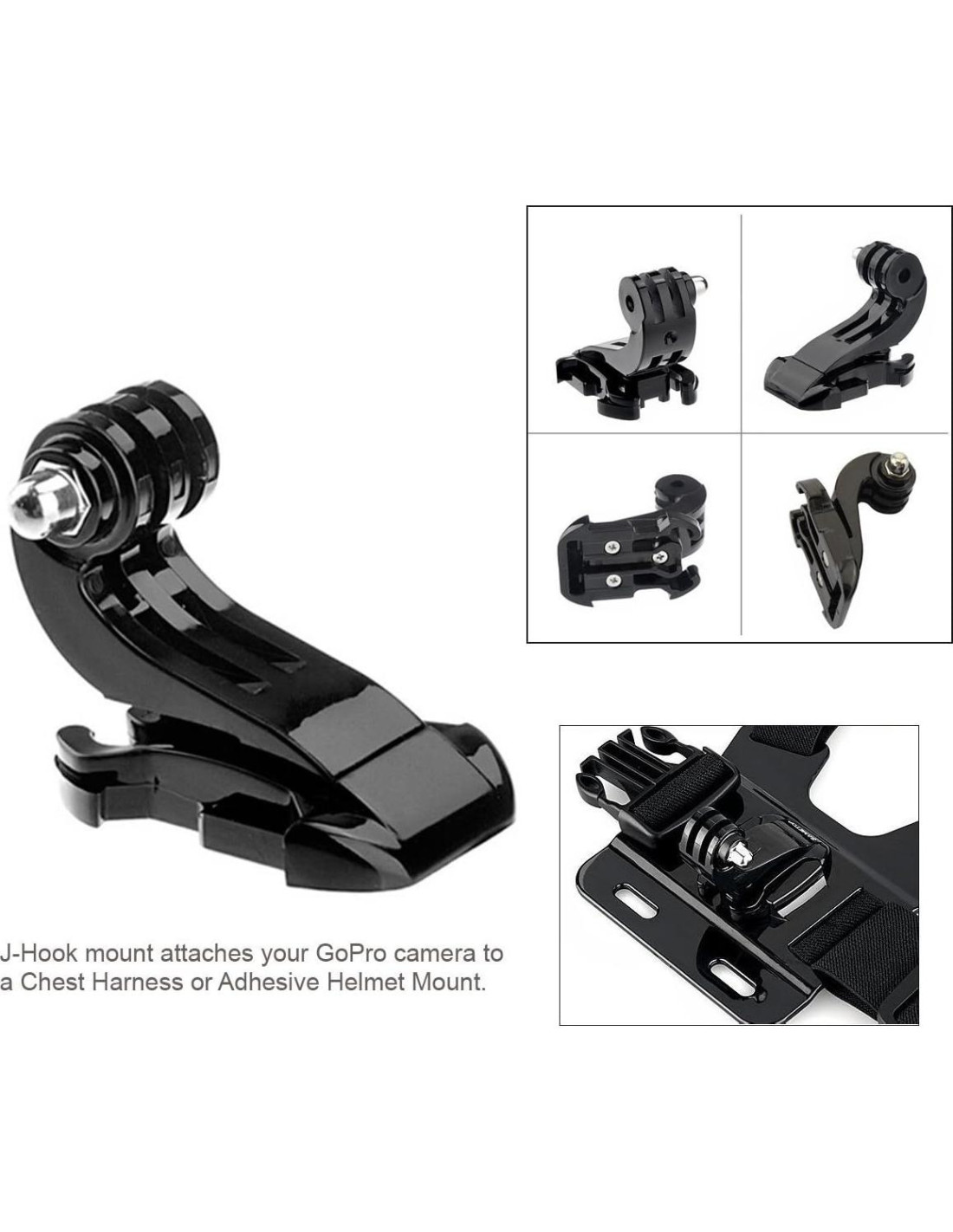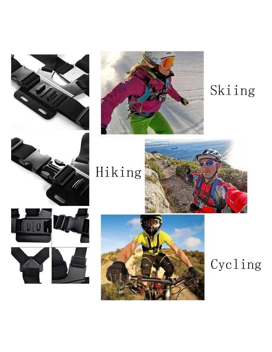 - Arnés de Montaje en el Pecho + J-Hook + Tornillo de Pulgar: Lleva la cámara de acción en tu pecho para capturar más de tus brazos, rodillas, bastones y esquís mientras esquías y más de tus brazos y manillares mientras andas en bicicleta o conduces tu motocicleta.