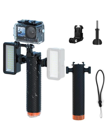 - 2. Empuñadura flotante que facilita la flotación de la cámara en el agua. Esto permite una grabación segura bajo el agua o en la orilla. Ideal para buceo en aguas profundas, esnórquel, natación, surf y otros deportes acuáticos.