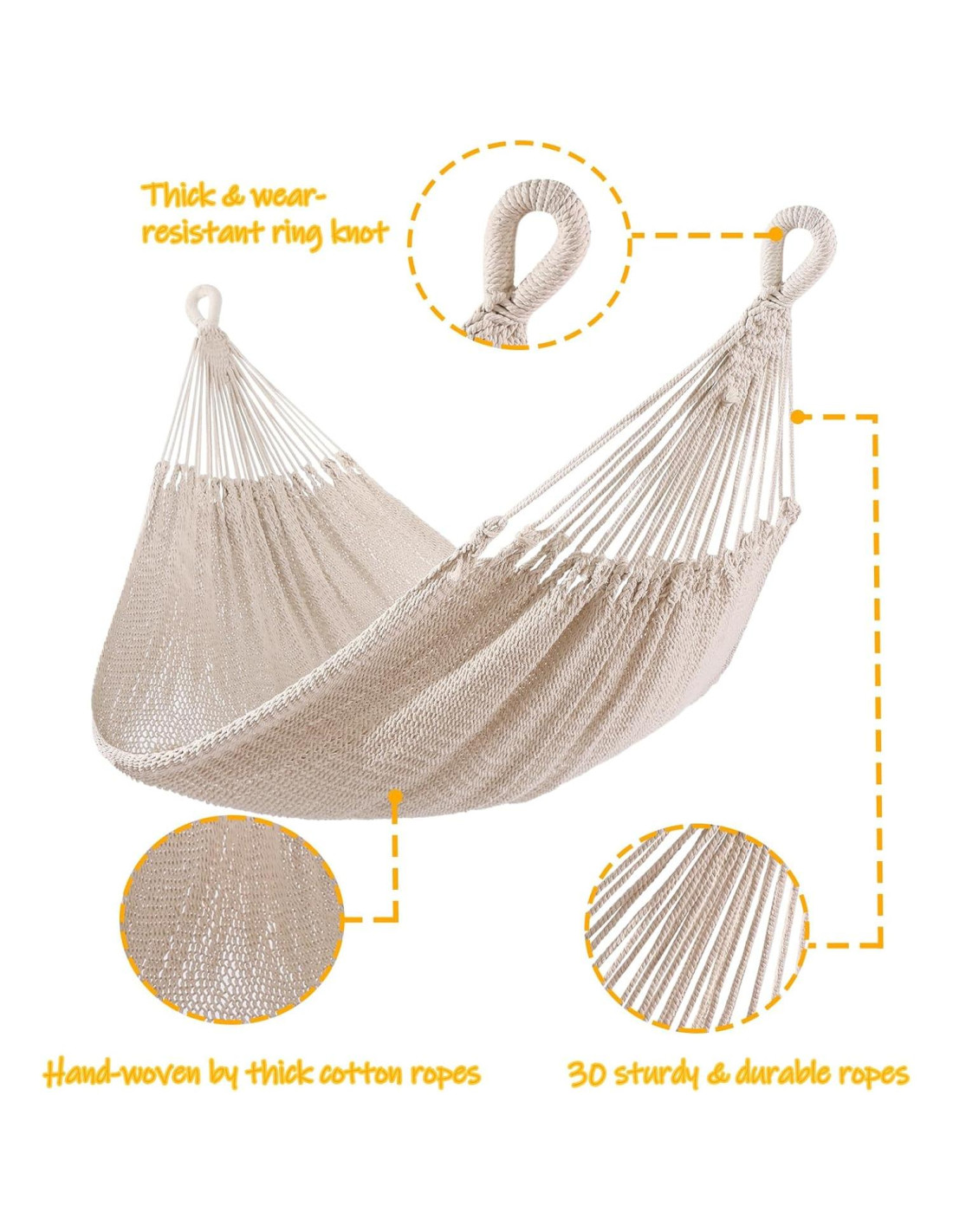 - Hamaca Super Grande: La hamaca XXL estándar super grande puede acomodar fácilmente y cómodamente a varias personas para relajarse juntas y disfrutar del momento de relajación. Mejor opción como hamaca familiar.