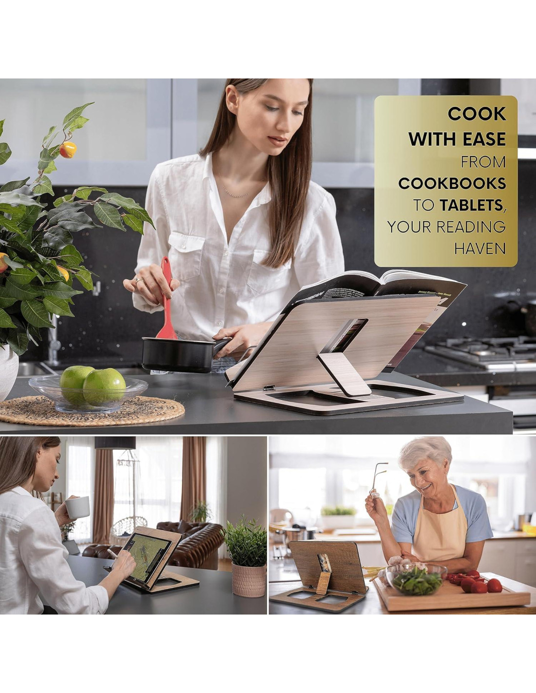 - Material de alta calidad: El soporte de libros de madera Vigo está hecho de madera premium de 8 mm, proporcionando estabilidad y durabilidad con resistencia a rayones, abrasión, desvanecimiento y agua. Ideal para usar como soporte de libros de cocina o soporte de libros de cocina.