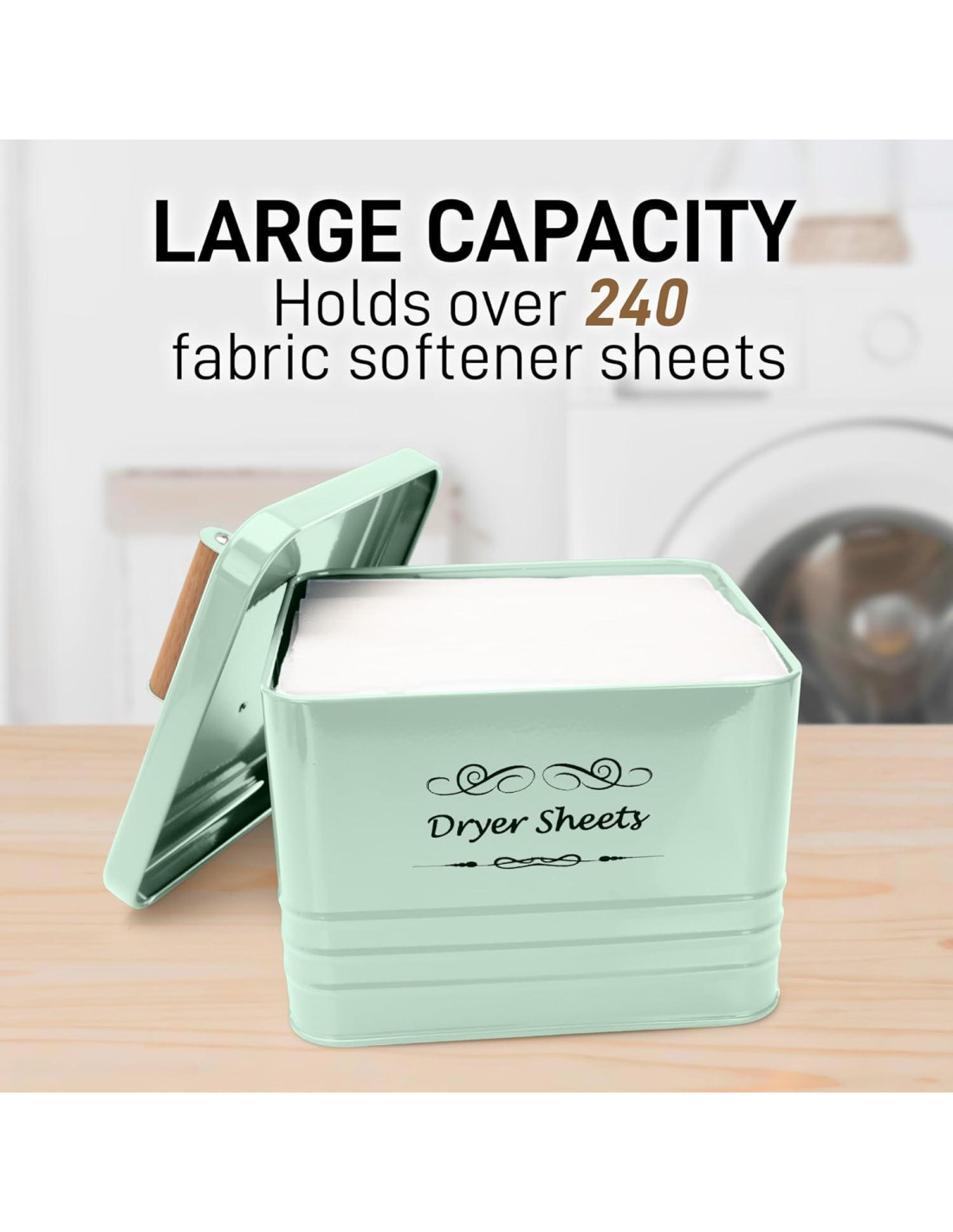 - CALIDAD PREMIUM Y TAMAÑO IDEAL: Hecho de metal de alta calidad, este soporte para hojas de secadora es perfecto para el uso diario. También viene con un mango de madera y una tapa para mantener las hojas de lavandería frescas. Este soporte para hojas de lavandería mide 17.78 cm x 15.24 cm x 12.7 cm y puede almacenar hasta 240 hojas de suavizante de tela de tamaño estándar.