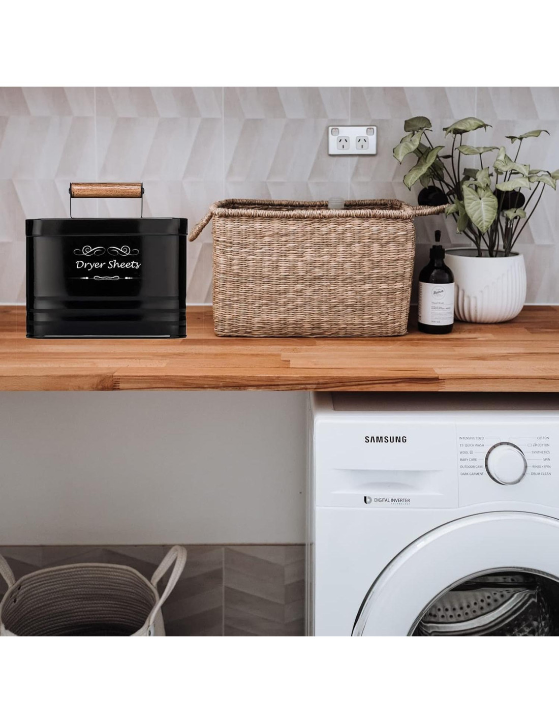 - SOPORTE PARA HOJAS DE SECADORA PARA EL LAVADERO: Eleva la decoración de tu lavadero con nuestro contenedor de hojas de secadora de estilo moderno de granja. Mantén el área perfectamente organizada sin ocupar mucho espacio de almacenamiento colocándolo en la estantería, encimera o bandejas decorativas.