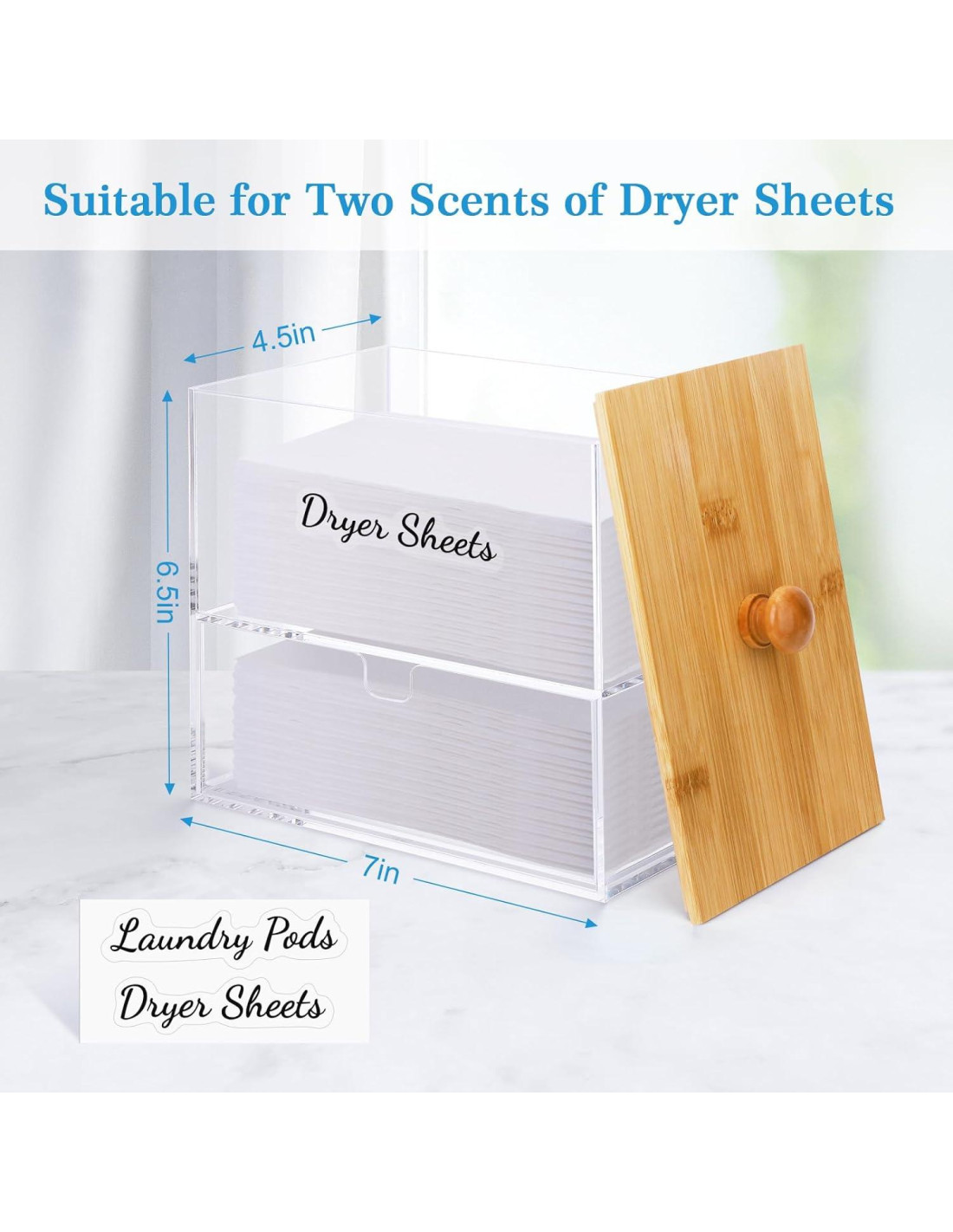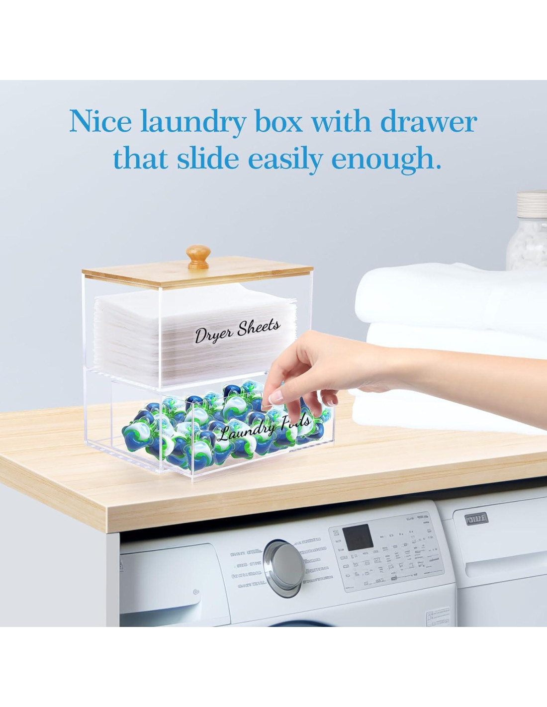 - ORGANIZACIÓN DE LAVANDERÍA - Nuestros contenedores de cápsulas de lavandería están hechos de acrílico de 3 mm de grosor premium y vienen con una tapa de bambú natural resistente. Puedes mirar a través de la caja de secadora y rellenarla antes de que se agote. Este material premium asegura durabilidad a largo plazo, convirtiéndolo en el compañero perfecto para tus necesidades diarias de lavandería.