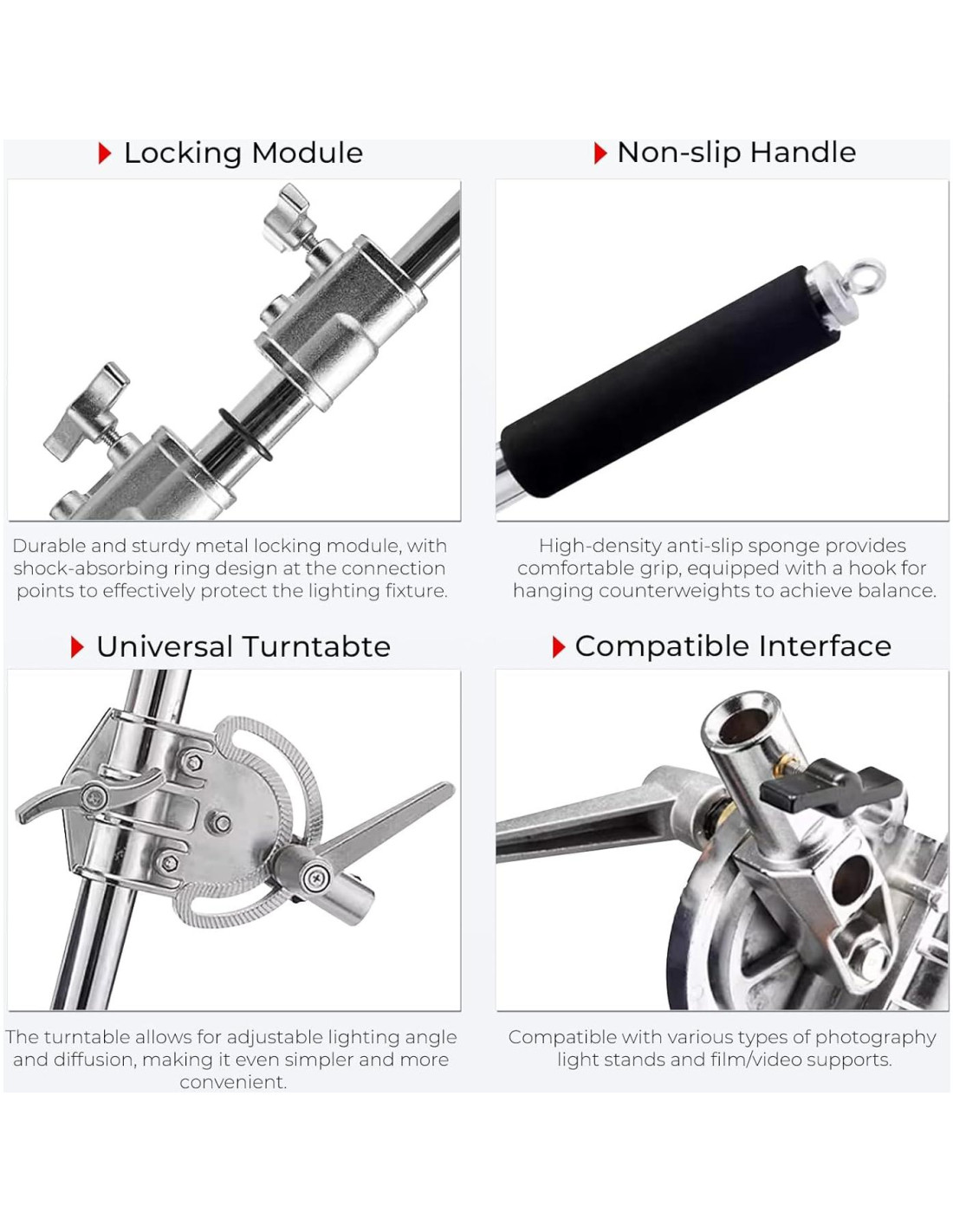 - [Capacidad de Peso] Nuestro brazo de boom para C-Stand puede soportar hasta 44 lb (20 kg) de peso, lo que significa que puedes usarlo para sostener incluso fuentes de luz pesadas de manera segura.