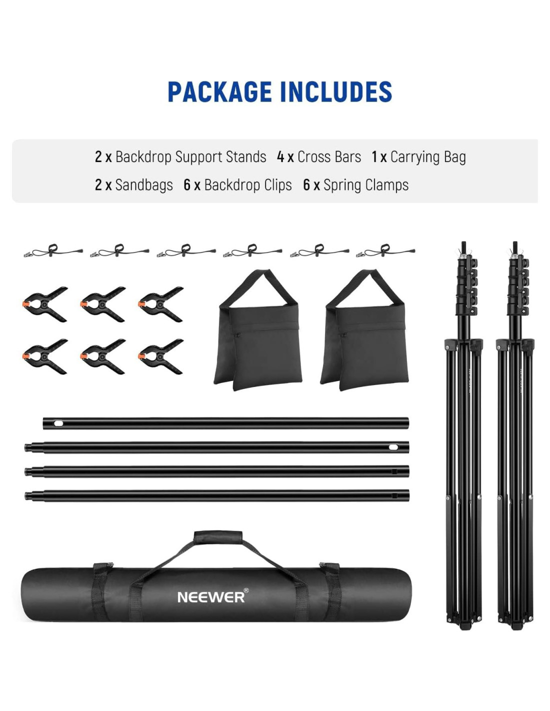 - [Sistema Completo de Soporte de Fondo] Este kit de soporte de fondo incluye 2 soportes de fondo, 4 barras transversales, 6 abrazaderas de resorte, 6 clips de fondo, 2 bolsas de arena y 1 bolsa de transporte.