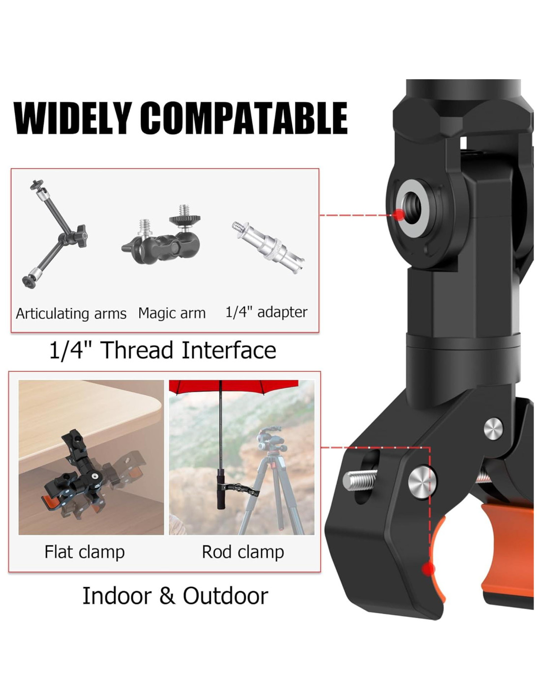 - Montajes de Doble Abrazadera: ¡El Brazo Mágico de Doble Abrazadera está aquí para revolucionar la forma en que piensas sobre el montaje! Su diseño innovador y no tradicional hace que el montaje sea más seguro, así como que las abrazaderas dobles no sean fáciles de separar y romper. Abrazadera doble con interruptor ajustable que ajusta la abrazadera al ángulo que deseas, permitiendo la abrazadera super 180 y un lado del cangrejo 360 ajuste de nivel.