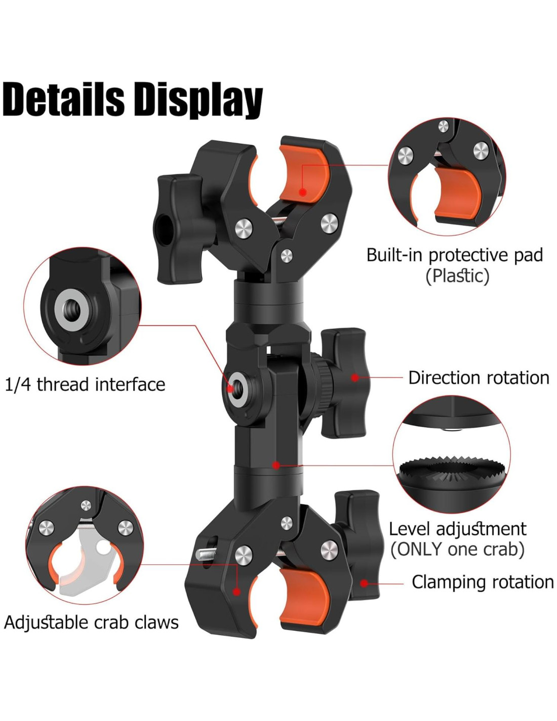 - Abrazadera Multifuncional: La distancia abierta de los cangrejos dobles es de 1.7~4 cm (0.66~1.57 pulgadas), permitiendo que la abrazadera se monte en el tamaño adecuado de manillares de bicicletas o motocicletas / postes / varillas / escritorios / mesas / tubos / banderas / botes / sillas, etc. Adecuado para Fotografía cuando se requieren accesorios adicionales para la toma, como abrazar soportes de luz, trípodes, reflectores, palos para selfies, paraguas, barras transversales, etc.