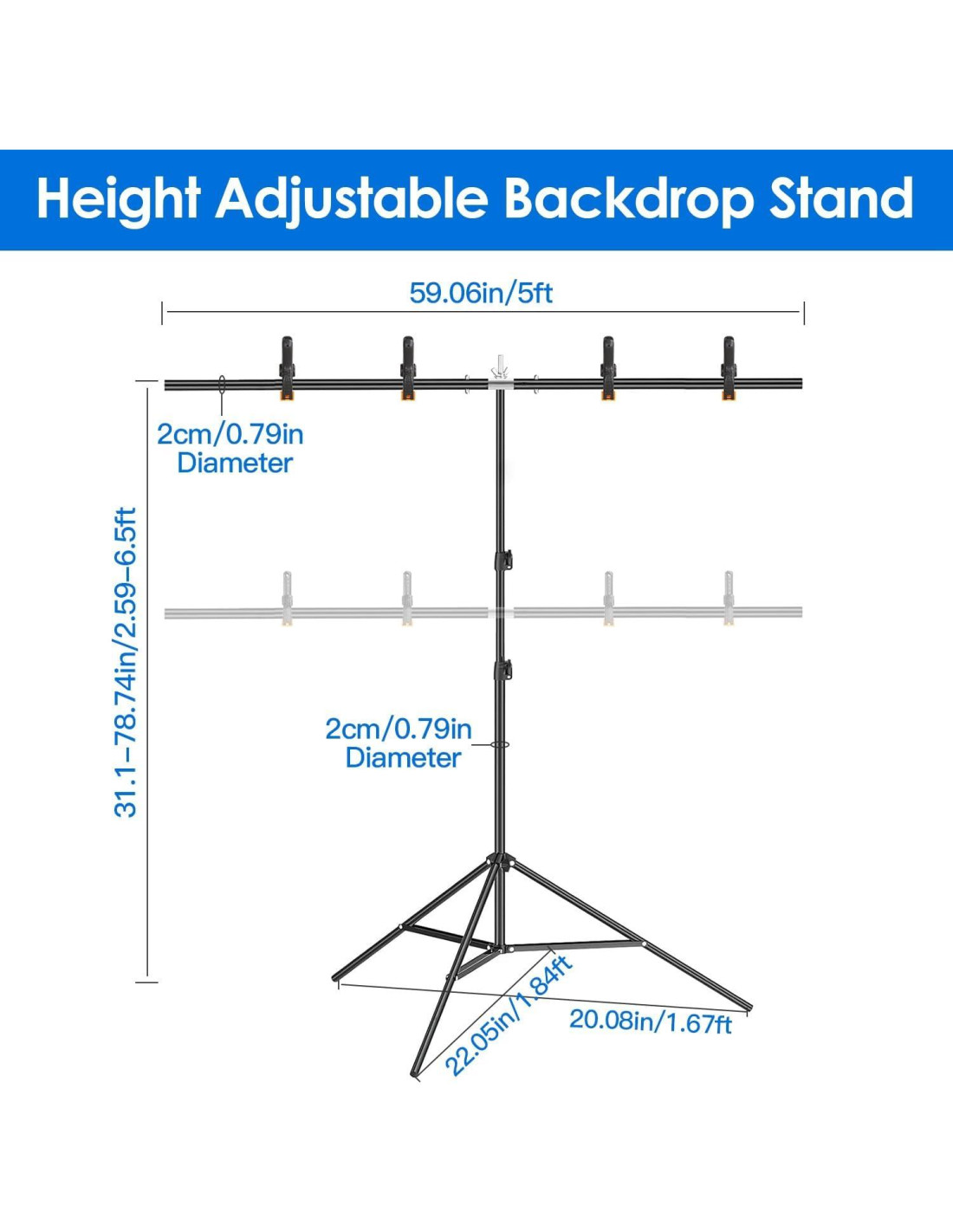 - Altura Ajustable de 0.79-1.98m: El soporte de fondo en forma de T ofrece un ancho de 1.49m y un rango de altura ajustable de 0.79m a 1.98m, atendiendo a diversas necesidades de grabación. Puedes posicionar el fondo al nivel perfecto para tus requisitos.