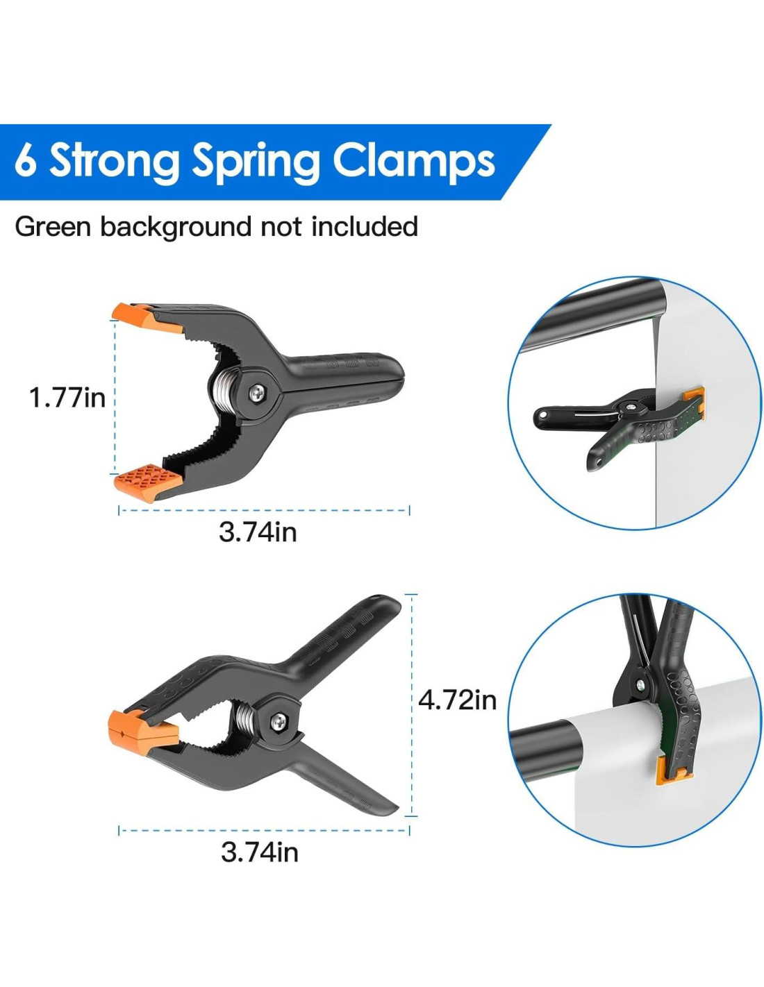 - 6 Pinzas de Resorte: Nuestro pequeño soporte de fondo viene con 6 pinzas de resorte para sujetar lienzos, muselinas o fondos de papel. Los dientes móviles en la pinza sujetan el fondo en cualquier dirección. La fuerte resorte y la superficie rugosa permiten sujetar cualquier cosa al soporte de manera firme.