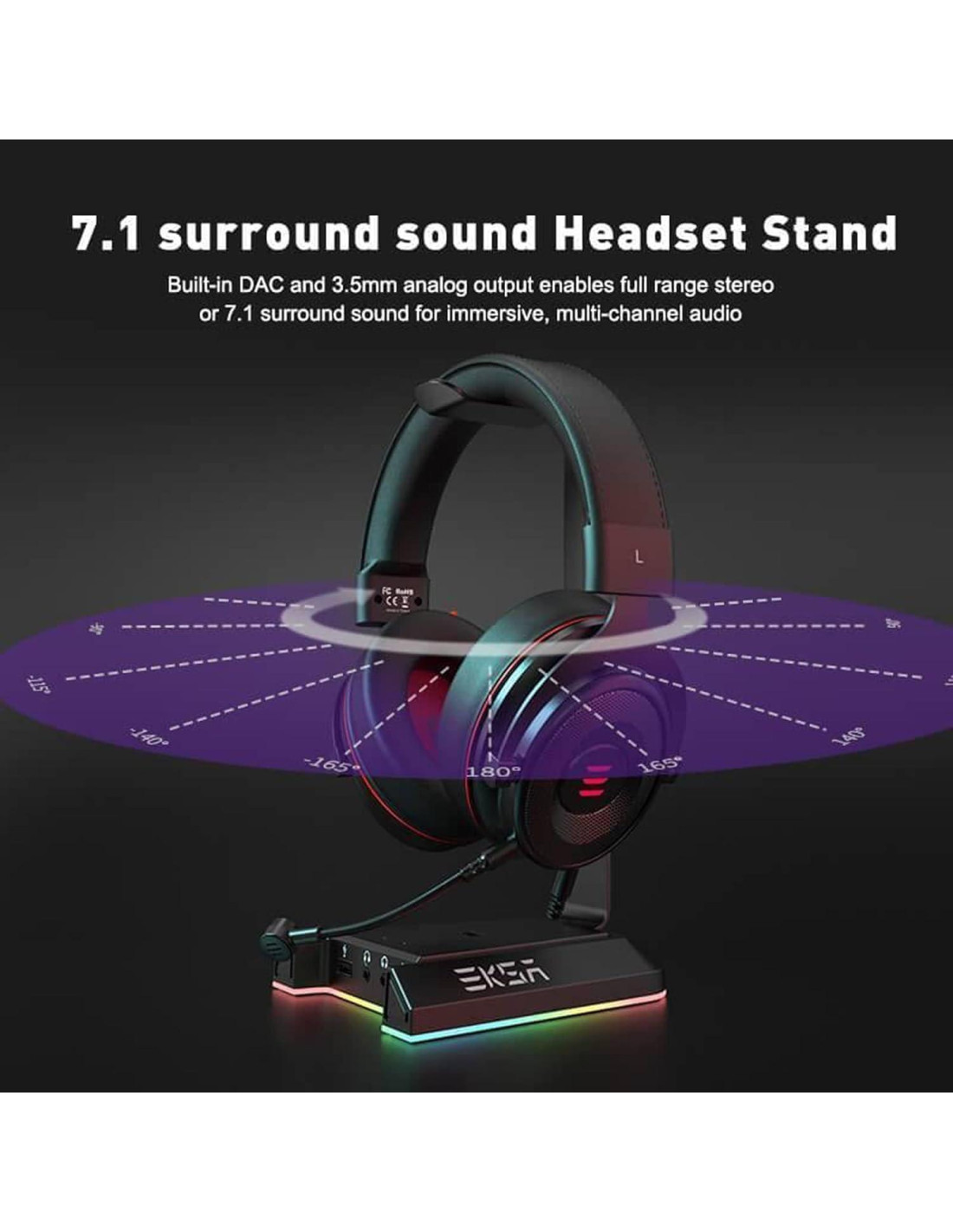 - [Soporte para Auriculares con Sonido Envolvente 7.1] Descarga e instala el controlador de Sonido Envolvente 7.1 desde el sitio web oficial de EKSA, este soporte para auriculares de escritorio puede ofrecer un rango completo de sonido envolvente virtual 7.1 cuando se empareja con auriculares ordinarios a través de puertos USB o conectores de audio de 3.5mm, brindándote una experiencia de juego inmersiva.