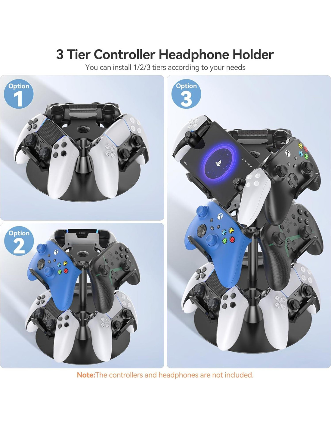 - Se adapta a varios accesorios: Ya seas fanático del último Xbox, PlayStation, Nintendo, controladores populares o smartphone, este soporte te tiene cubierto. Ya sea que estés tomando un breve descanso para revisar tus mensajes o quieras cambiar entre diferentes experiencias de juego, todo lo que necesitas está al alcance de tu mano. Es la solución definitiva para mantener tu área de juego ordenada y tu experiencia de juego fluida.