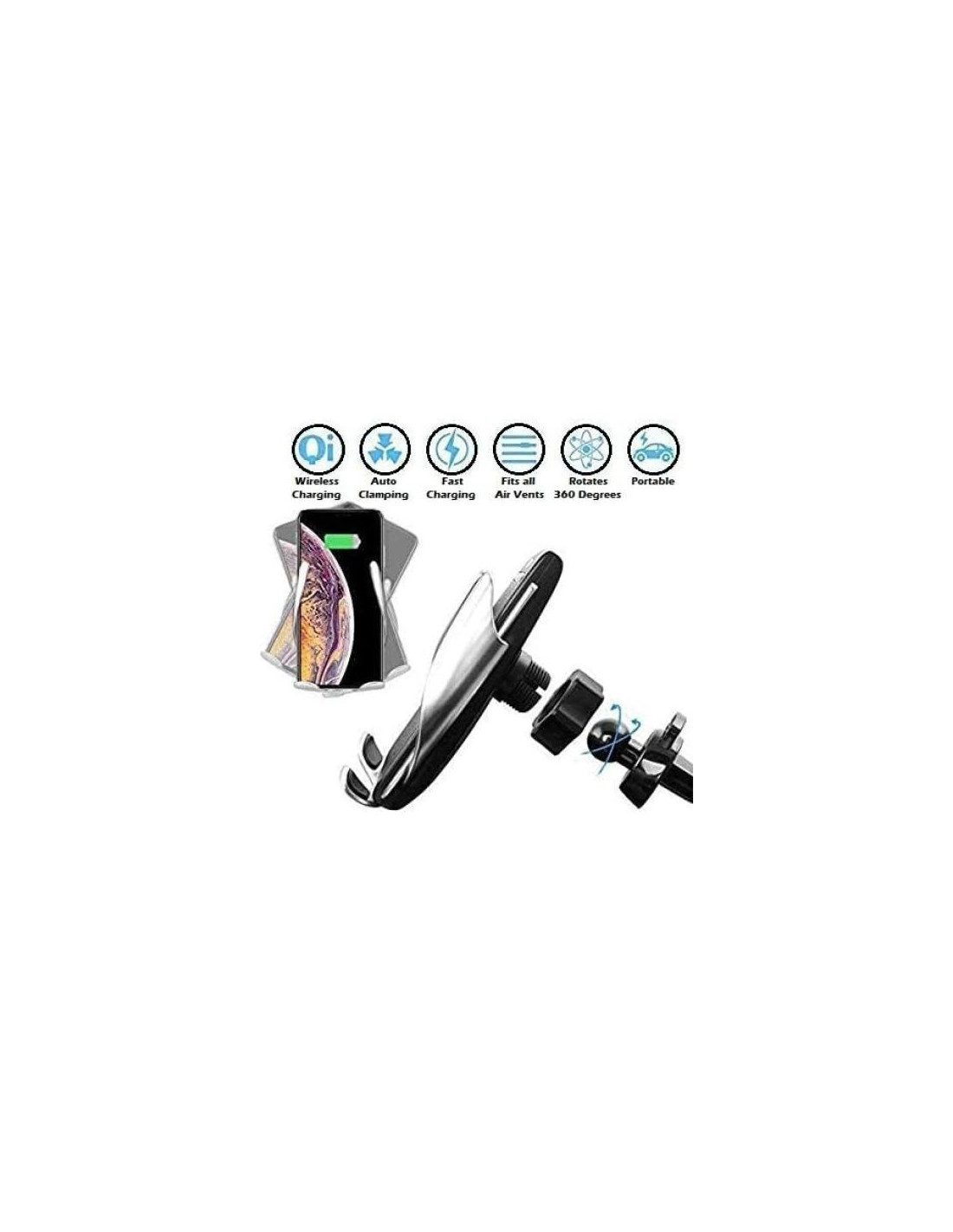 - SOPORTE PARA TELÉFONO MÓVIL EN COCHE CON ROTACIÓN DE 360: Nuestro soporte de cargador de coche QI utiliza materiales de baja resistencia para soportar la carga inalámbrica incluso con fundas de teléfono gruesas de hasta 6 mm. El soporte para teléfono de ventilación del coche se puede ajustar en cualquier dirección o ángulo que necesite, ya sea horizontal o vertical. Gracias al diseño flexible de la junta de bola de 360 grados.