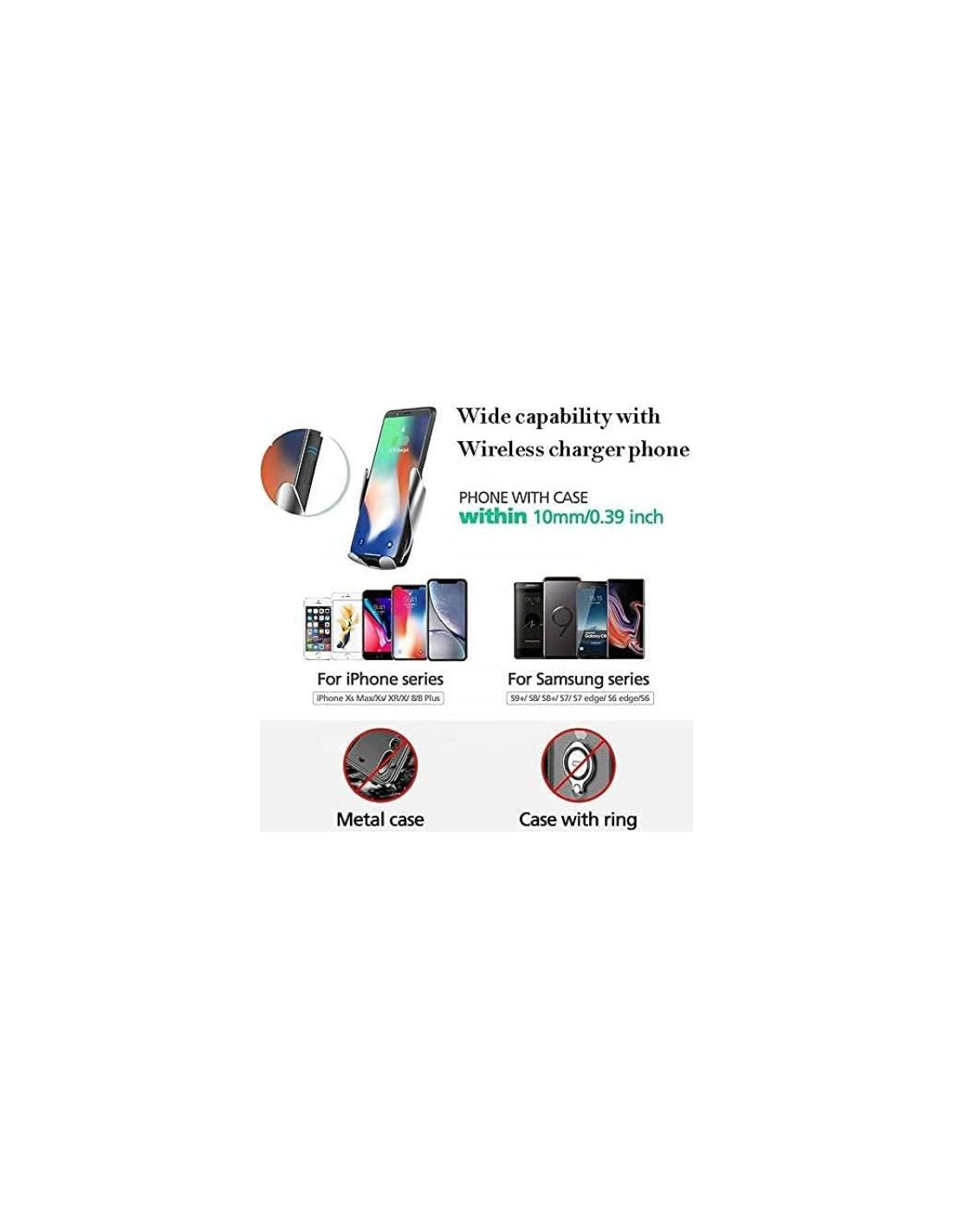 - COMPATIBLE CON LOS ÚLTIMOS SMARTPHONES: Nuestro soporte para teléfono móvil de coche inalámbrico es compatible con todos los últimos modelos de smartphones. Compatible con cualquier dispositivo de carga inalámbrica Qi, funciona con todos los modelos de iPhone 8 y posteriores, Samsung S6 y posteriores. Excepto por fundas metálicas y fundas con anillo, no es necesario quitar la funda del teléfono dentro de un grosor de 10mm; puede cargarse directamente.