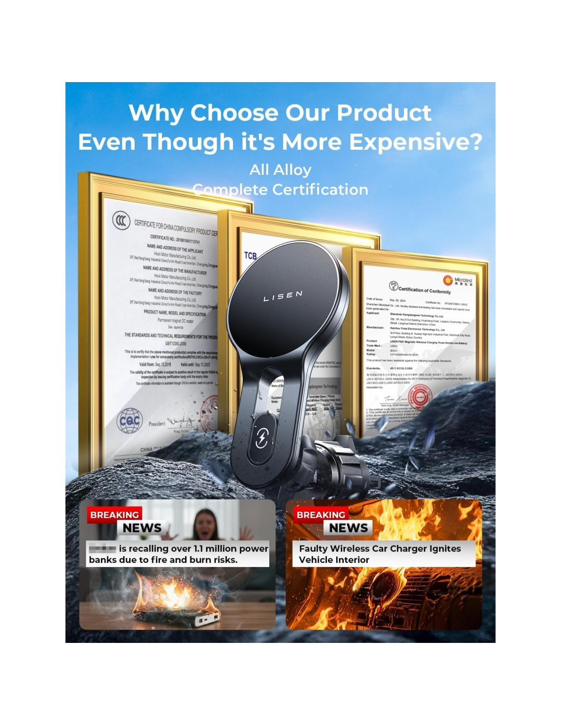 - Liberación con un Clic: Disfruta de la conveniencia de la operación con un clic para una fácil colocación y extracción del teléfono. No es necesario preocuparse por pasos de instalación complejos, manteniéndote enfocado en tu conducción, el soporte de montaje rápido LISEN MagSafe 3 es adecuado para la serie iPhone 116/15/14/13/12 y otros teléfonos que soportan carga MagSafe. Proporcionamos una solución integral para satisfacer todas tus necesidades de carga.