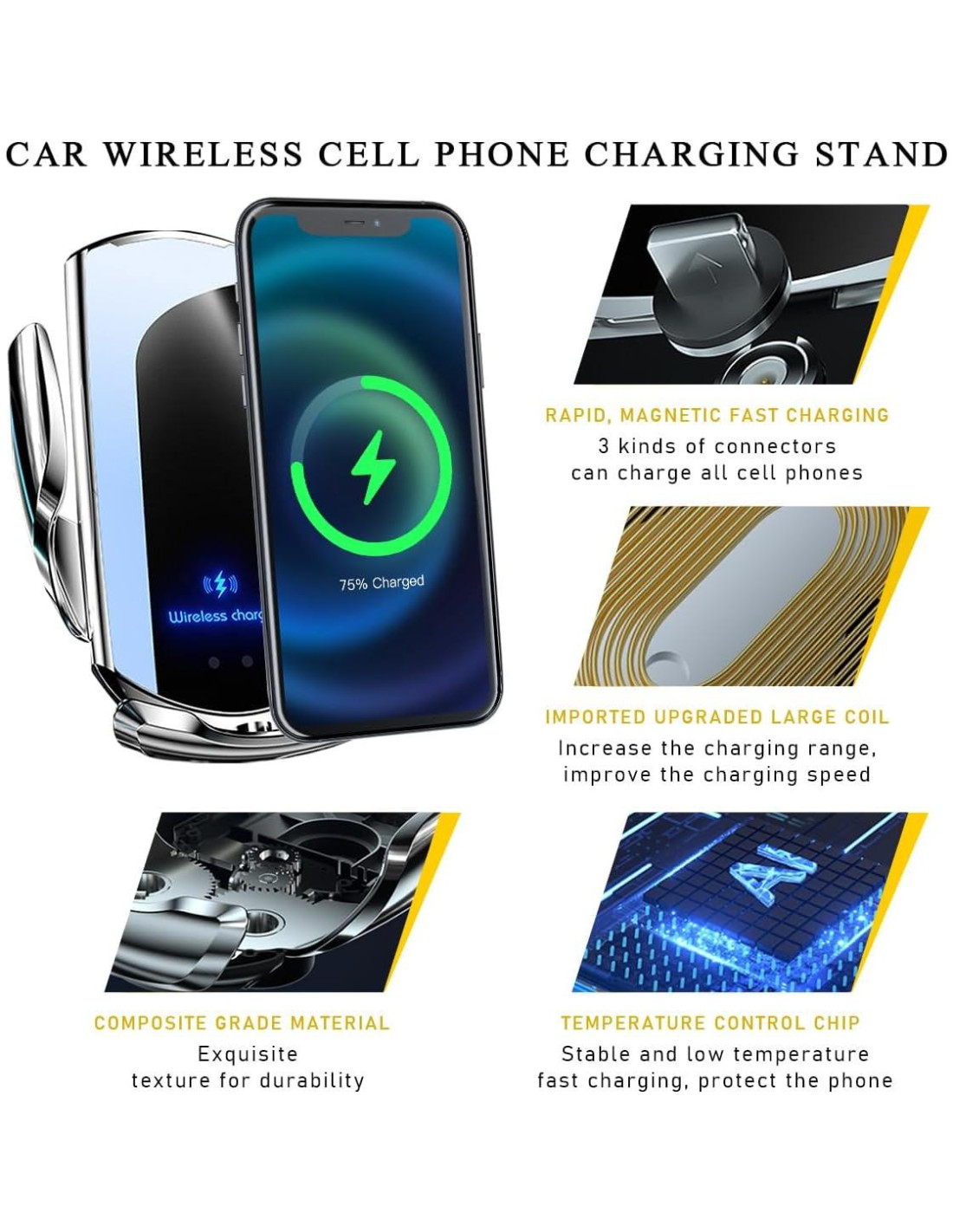- Características especiales: Cargador Inalámbrico para Coche antideslizante, Carga Rápida de 15W, Auto-Cierre, Soporte de Teléfono para Ventilación de Aire, Soporte de Cargador Inalámbrico para Coche