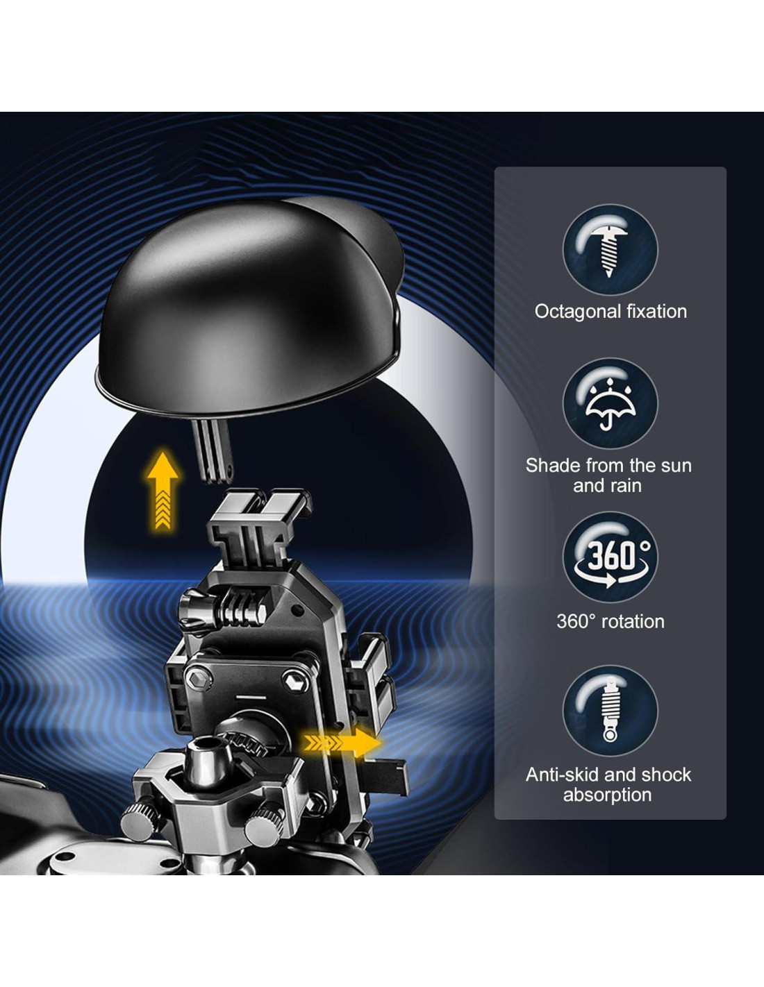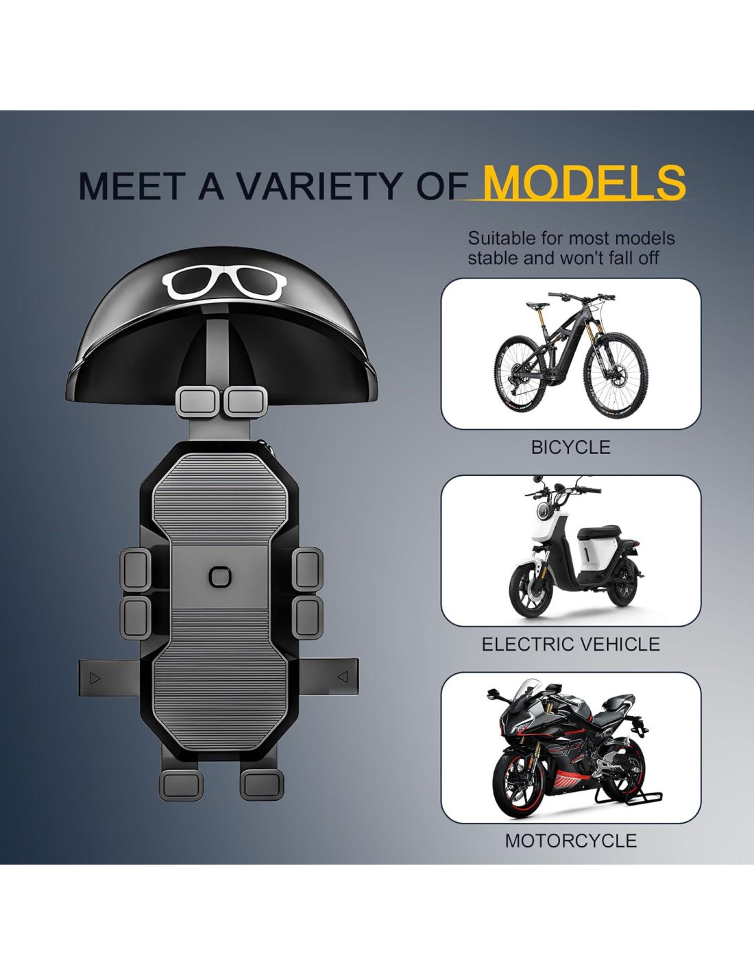 - Protección Solar y Refugio de Lluvia: El producto viene con un casco que se puede ajustar hacia adelante y hacia atrás y se puede abrir o cerrar. No hay miedo a que el teléfono móvil se moje, y también puede bloquear eficazmente el sol. No hay necesidad de temer que el reflejo del teléfono móvil y la pantalla no se vean claramente, lo que mejora eficazmente la visibilidad del teléfono móvil.