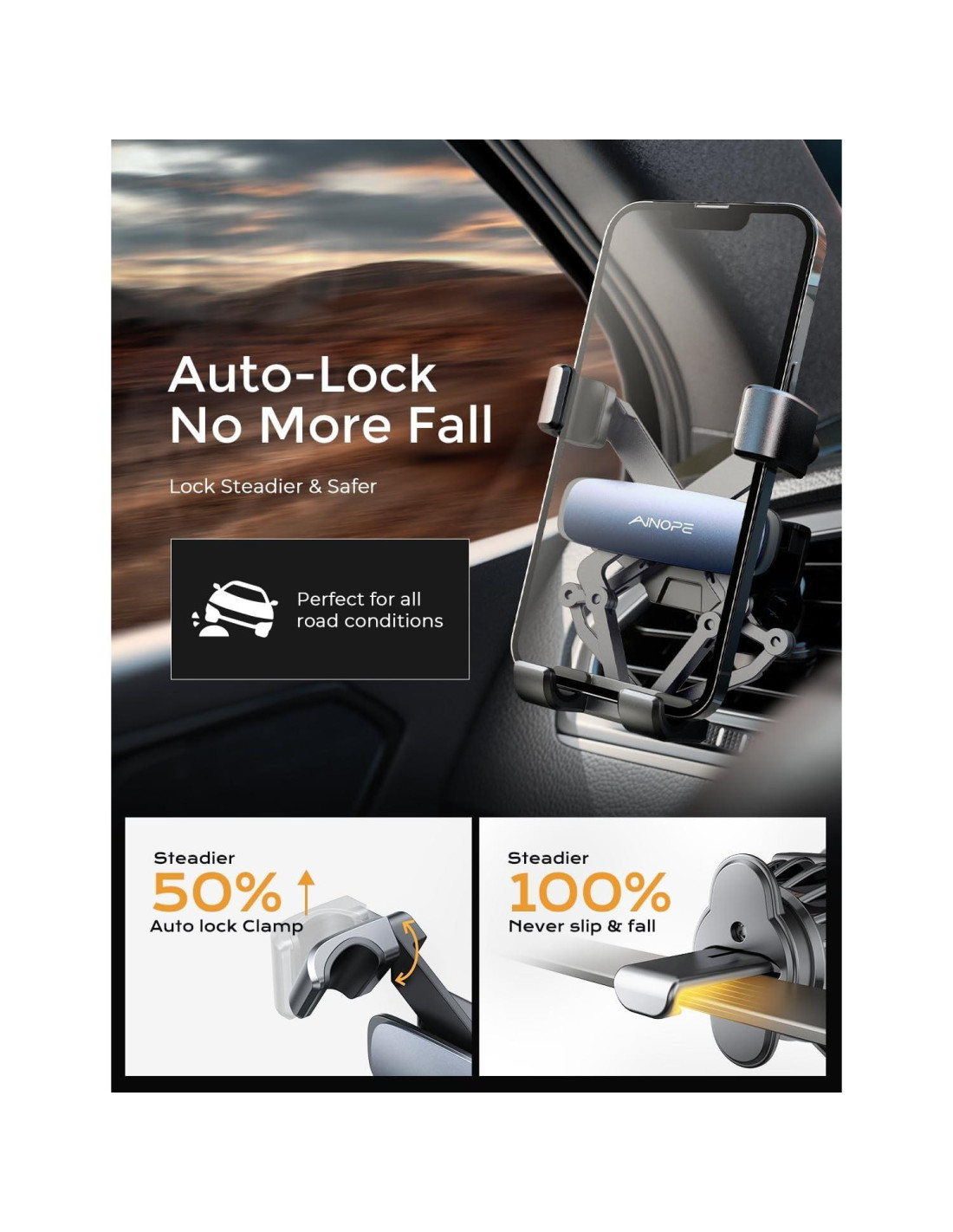 - LA OPERACIÓN MÁS FÁCIL Y SOLO DESLIZA Y VE: Solo desliza tu teléfono, el soporte para teléfono en la ventilación del auto sujeta el teléfono automáticamente por gravedad y proporciona la operación más fácil y un agarre fuerte y estable sin botón que presionar. Comparado con el viejo soporte para teléfono en la ventilación del auto, ya no necesitas usar las manos para pasar demasiado tiempo mirando hacia abajo para colocar el teléfono mientras restableces la ruta de navegación. Al salir del auto con prisa, solo recoge el teléfono y vete en segundos.
