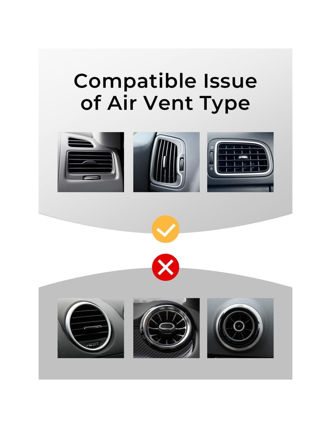 - La pieza metálica no debe colocarse entre la funda y el teléfono, lo que hará que la fuerza magnética se debilite y reduzca la estabilidad del soporte. Solo para ventilaciones de aire cuadradas, no para ventilaciones de aire redondas, por ejemplo, toda la serie Mercedes-Benz, serie Kia EV6.