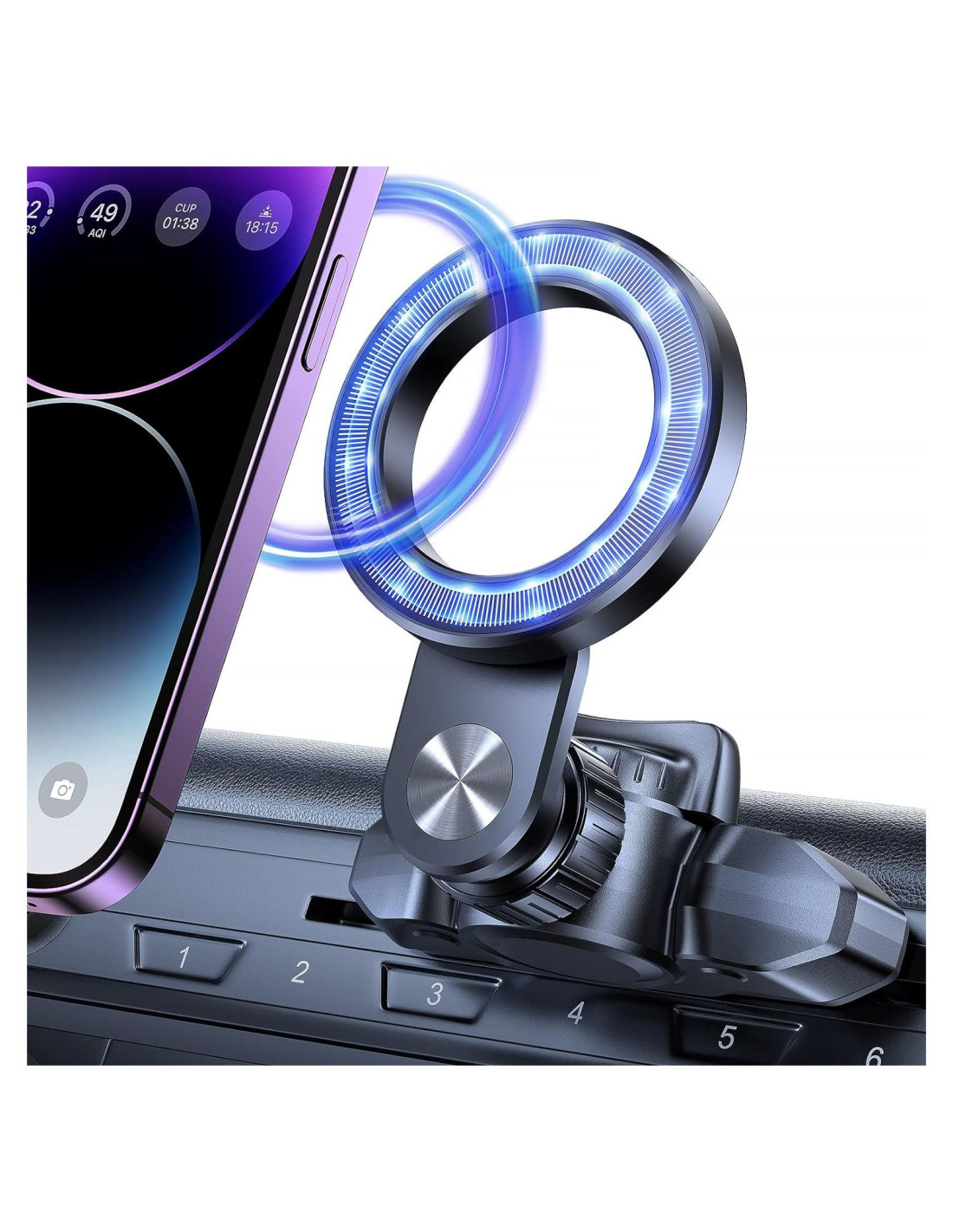 - Diseño de anillo hueco: Haciendo posible que los teléfonos con Pop-sockets (Máx 3.96 cm de diámetro) hagan que el interior de tu coche se vea compacto. Por último, reutiliza los puertos de CD inactivos de la mayoría de los coches.