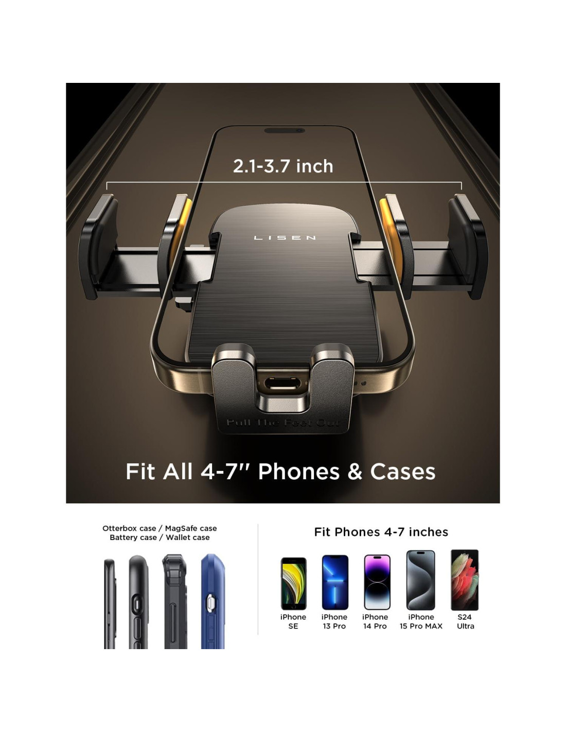 - [SE ADAPTA A TODOS LOS TELÉFONOS Y FUNDAS GRUESAS] Los pies ajustables y el brazo de clip ajustable más ancho del soporte para coche LISEN se adaptan perfectamente a todos los teléfonos celulares entre 10''-18'' y la mayoría de las fundas gruesas. Como para iPhone 16 15 Pro Max/14 Pro Max/14 Pro/14 Plus/14/13ProMax 13Pro 13 13Mini 12ProMax 12Pro 12 12Mini 11 11 Pro 11ProMax XSMax XS XR X 8 Plus 7 6S 6 5S SE, Samsung Galaxy S23 Ultra S22 S21+ S21 S20 S20+ S10 S10+ S10e S9 S9+ S8 S8+ S7 S6 y más, Pixel 6Pro 6 6a 5a 5 4XL 4 3XL 3 2, etc.