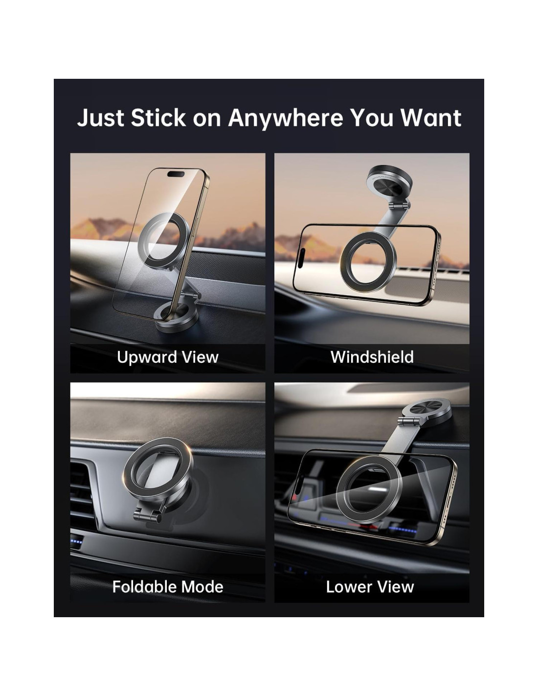 - Rotación de 360 y diseño plegable de dos ejes Con una base rotatable de 360 y un brazo de aleación de aluminio ajustable en dos ejes, este diseño se puede ajustar de manera flexible para crear una variedad de ángulos. Puedes fijar el soporte de coche MagSafe en cualquier escena, como el tablero del coche, el parabrisas, la pantalla de Tesla y el escritorio. El diseño plegable te permite ocultar el soporte para teléfono de coche para crear un entorno de uso más ordenado.