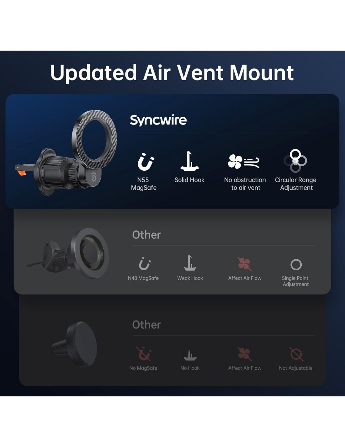 - [Sin interferencias] El soporte de ventilación MagSafe para coche cuenta con un diseño circular para garantizar una recepción de señal ininterrumpida mientras reduce la tensión de la ventilación y mantiene un flujo de aire óptimo para una disipación de calor efectiva. Eleva tu experiencia de conducción con el soporte de ventilación MagSafe de SYNCWIRE y disfruta de un viaje seguro y fiable.