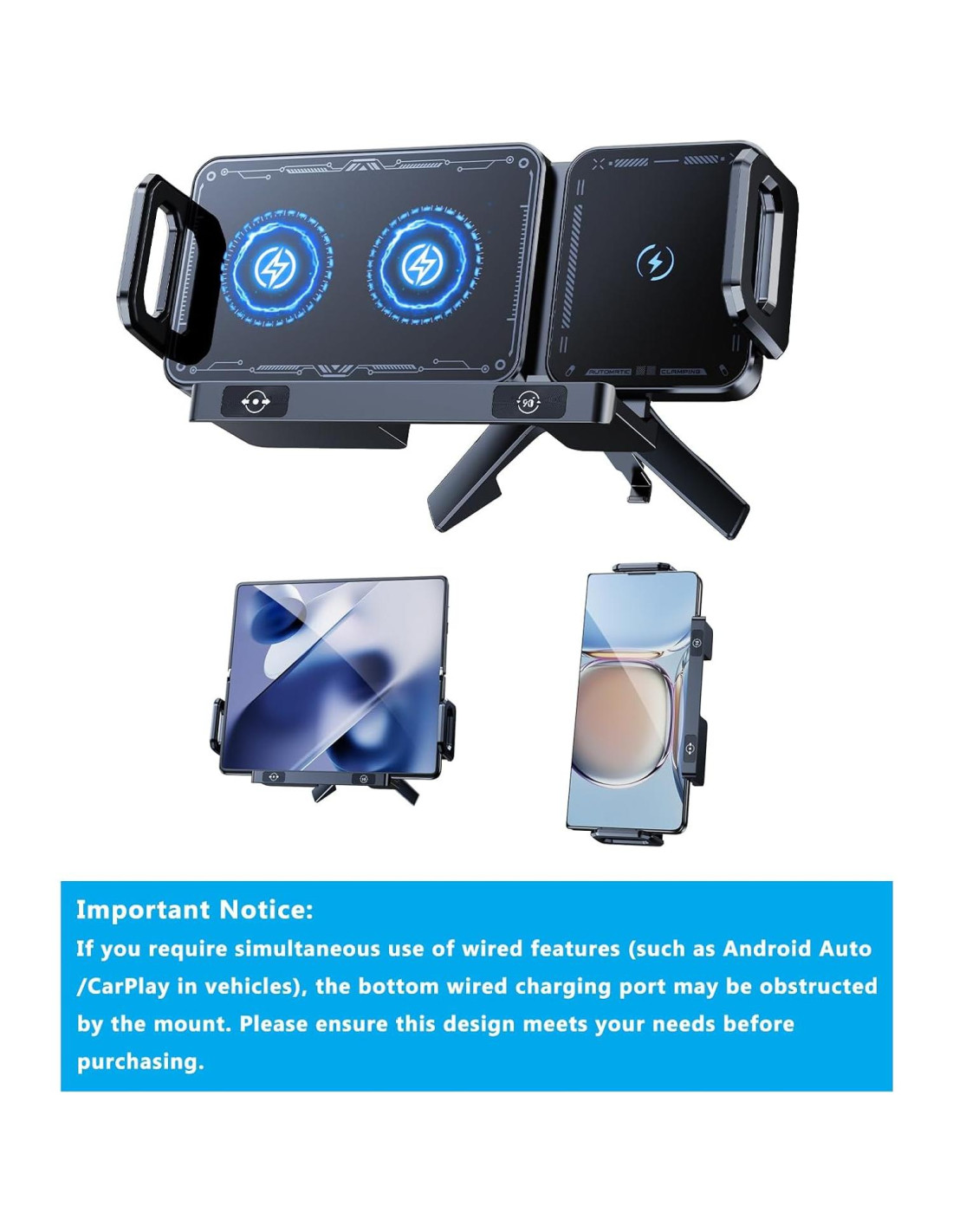 - [ - Diseño de Pantalla Ancha - ] Diseñado especialmente para teléfonos con pantallas grandes y plegables, permite que tu Galaxy Z Fold6/Fold5/Fold4/Fold3 se coloque verticalmente sin bloquear los botones, área de carga amplia, fácil alineación y carga rápida. El brazo de sujeción puede extenderse y retraerse en el rango de 5.51-7.16 pulgadas (140-182 mm), que se puede usar no solo para teléfonos de pantalla plegable, sino también para teléfonos celulares o tabletas ordinarias.