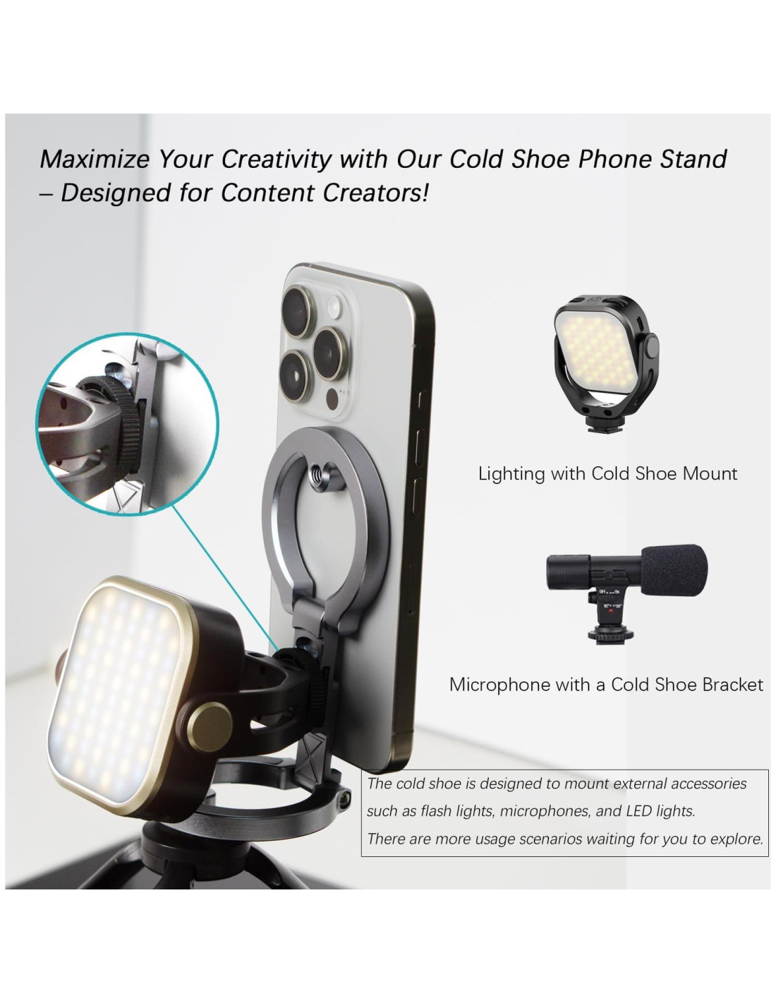 - Tornillos de 1/4" y Montajes de Zapata Fría: tres agujeros para tornillos de 1/4 de pulgada. Usa los agujeros de tornillo en la parte inferior para montarlo en un trípode para transmisión en vivo, fotografía, grabación de videos, selfies y escenas aéreas. Usa los agujeros de tornillo en el centro para montarlo en cualquiera de los lados y ver subtítulos en vivo en tu teléfono mientras transmites en vivo. También se puede usar con dispositivos como luces para selfies, luces de relleno y luces de anillo a través del conector de zapata fría.