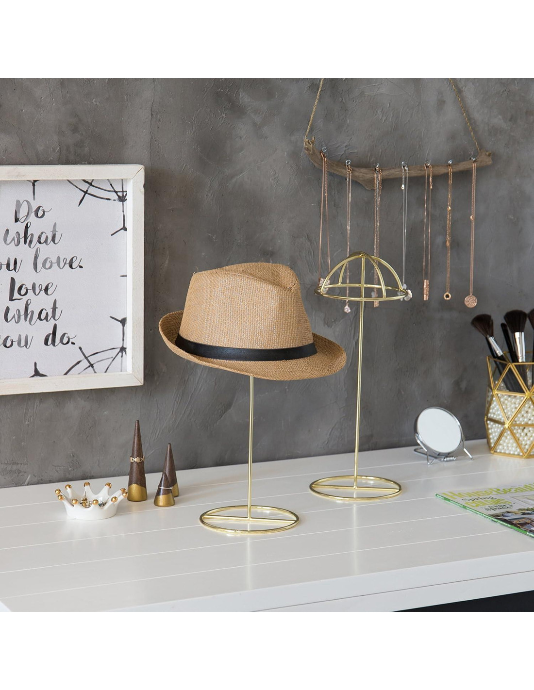 - Juego de 2 soportes de mesa para sombreros o pelucas con una construcción de metal de tono latón simple, una solución elegante para la organización del hogar o la comercialización minorista
