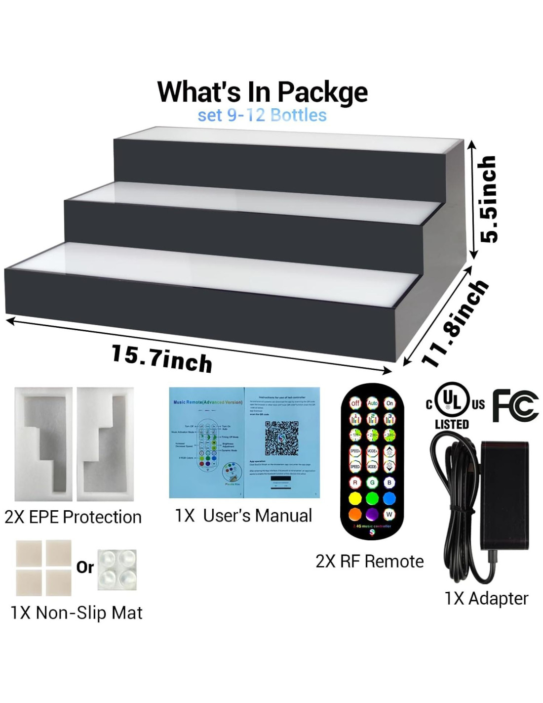 - [Materiales superiores duros y duraderos de 5 mm] - Nuestros estantes de bar iluminados tienen 5 mm de grosor de acrílico de alta resistencia. El lacado de piano de este estante de exhibición de licor es efectivo contra arañazos y manchas, y el acrílico blanco tiene buena transmitancia de luz. Su placa base tiene un diseño de transmisión de luz, por lo que la parte inferior del estante de exhibición de botellas de licor LED puede revelar una tenue luz ambiental. Los estantes de licor de alta calidad y duraderos pueden prevenir eficazmente accidentes causados por líquidos como alcohol, whisky, cerveza.