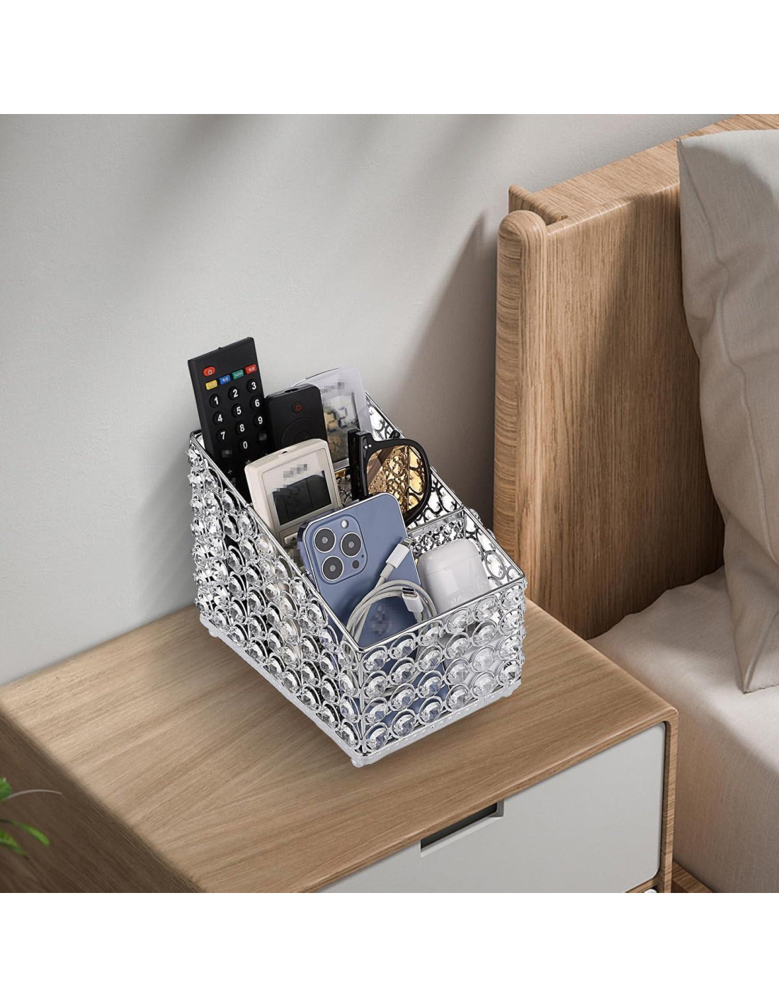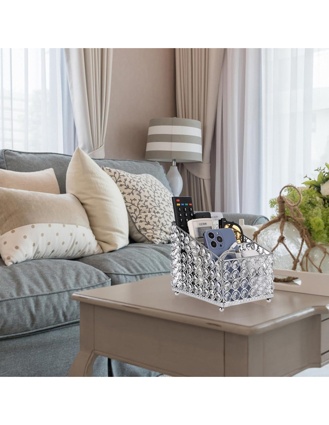 Descripción: Este hermoso soporte de control remoto está hecho de cuentas de cristal artificial de alta calidad y material de acero premium, es de calidad resistente que asegura que durará mucho tiempo. El organizador de controles remotos está lleno de estilo elegante y moderno que combinará bien con la mayoría de la decoración del hogar y le dará a todo un aspecto moderno. Al mismo tiempo, el organizador de controles remotos lo convierte en la adición perfecta a cualquier mesa o mostrador. Nuestro hermoso caddy de cristal para controles remotos se puede usar para almacenar controles remotos, tijeras, bolígrafo, lápiz y brocha de maquillaje. No solo es adecuado para uso en el hogar, sino también para oficinas, escuelas y habitaciones de hotel, y el diseño de estilo moderno hace que se vea bien en cualquier lugar. El único soporte de cristal para controles remotos es un accesorio para el hogar que es tanto elegante como práctico, por lo que puede ser un regalo perfecto para sus amigos, familiares, vecinos. Y perfecto para una casa nueva, Día de la Madre, Navidad, cumpleaños o regalo de boda. Especificaciones: - Color: Plateado - Material: Cristal + Acero Paquete incluido: 1 x Soporte de Control Remoto de Cristal con 3 Compartimentos