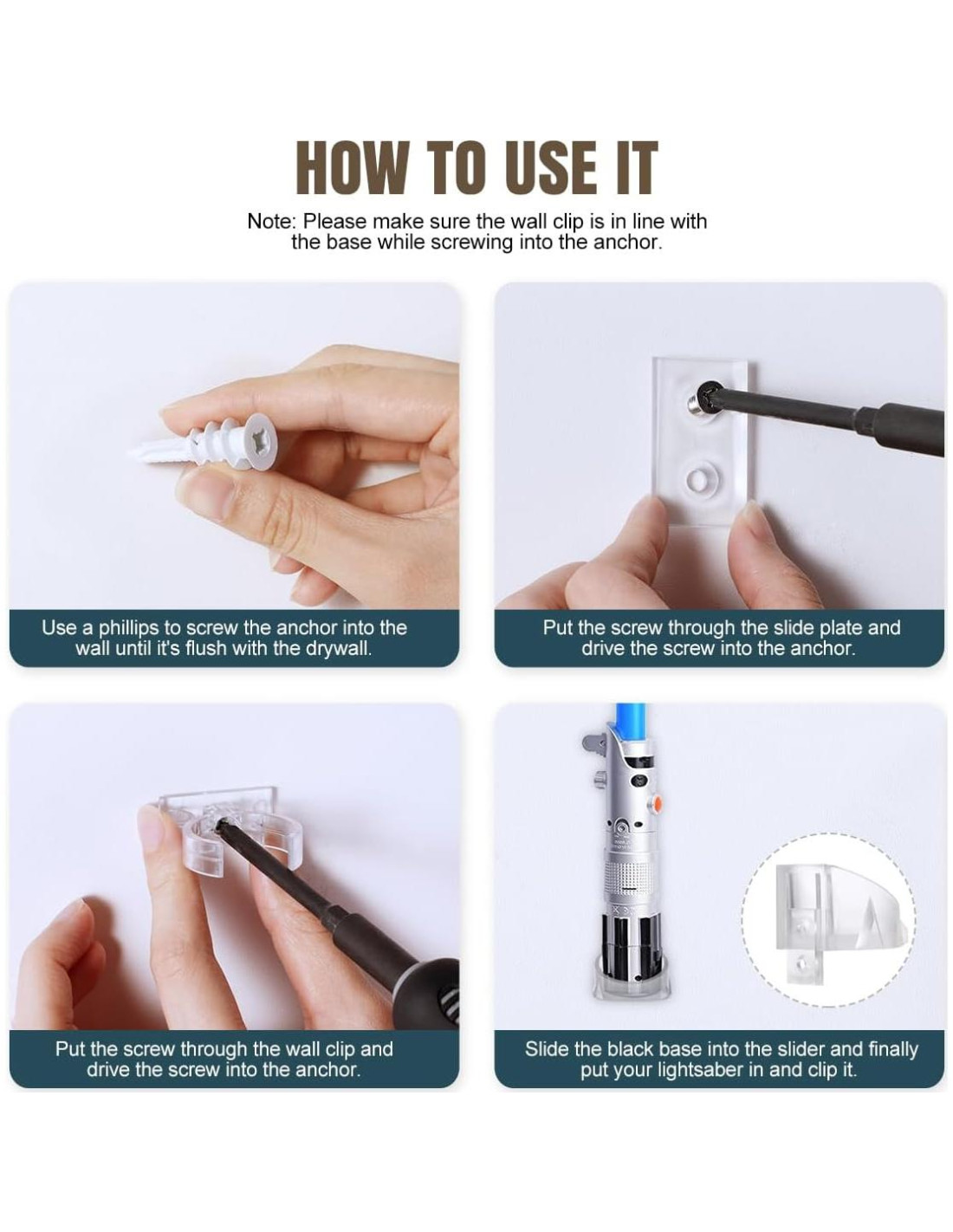 - Fácil de Usar: Usa un destornillador Phillips para atornillar el ancla en tu pared hasta que esté al ras con la pared de yeso. Monta la placa deslizante y el clip de pared en la pared. Desliza el soporte en el deslizador y finalmente coloca tu sable de luz y sujétalo