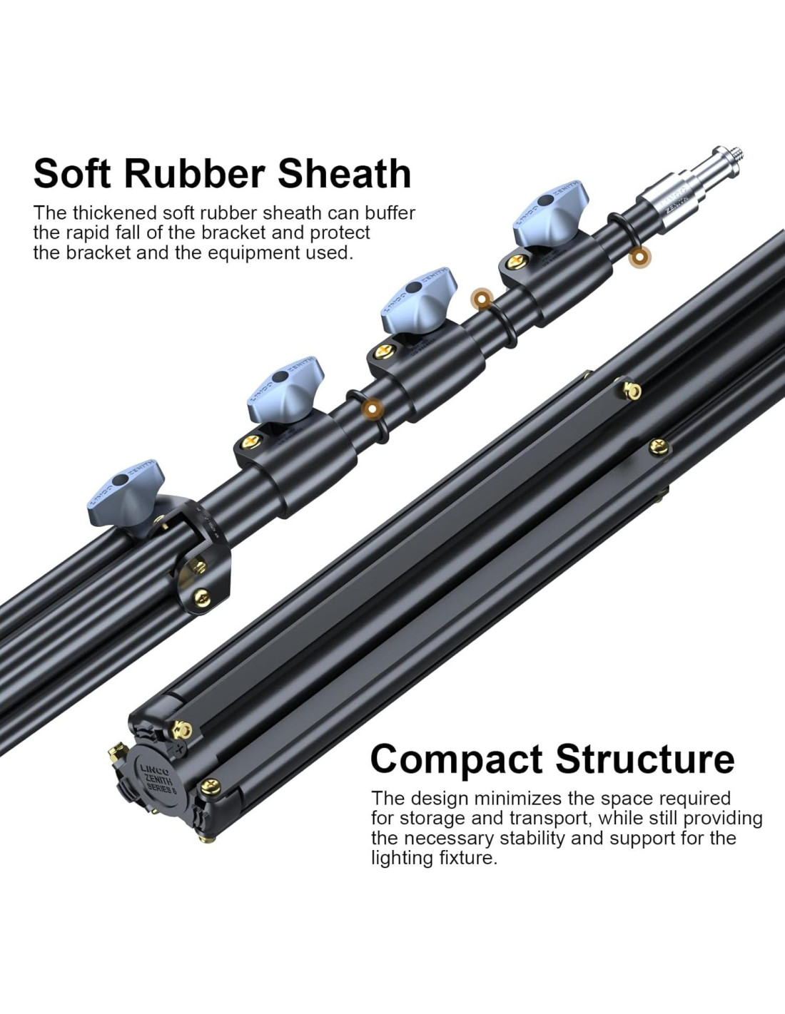 - Soportes de Luz Profesionales de 9 pies: Juego de dos soportes de luz LINCO Zenith, ideales para uso en estudio y en el lugar; Con una altura máxima de 9 pies (2.74 m) y una longitud plegada de 2.6 pies (0.79 m), estos soportes proporcionan estabilidad y fuerza para todas las configuraciones de iluminación