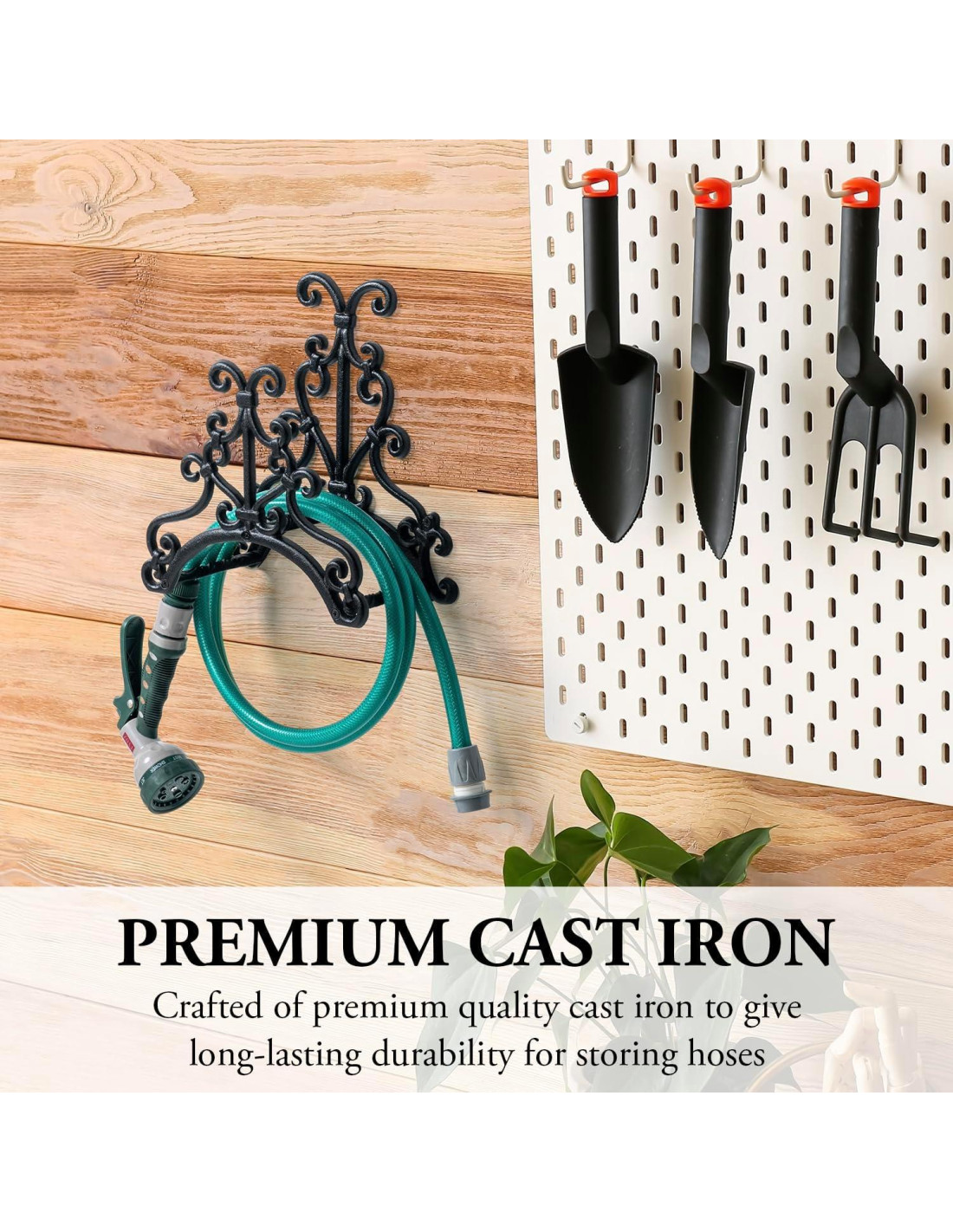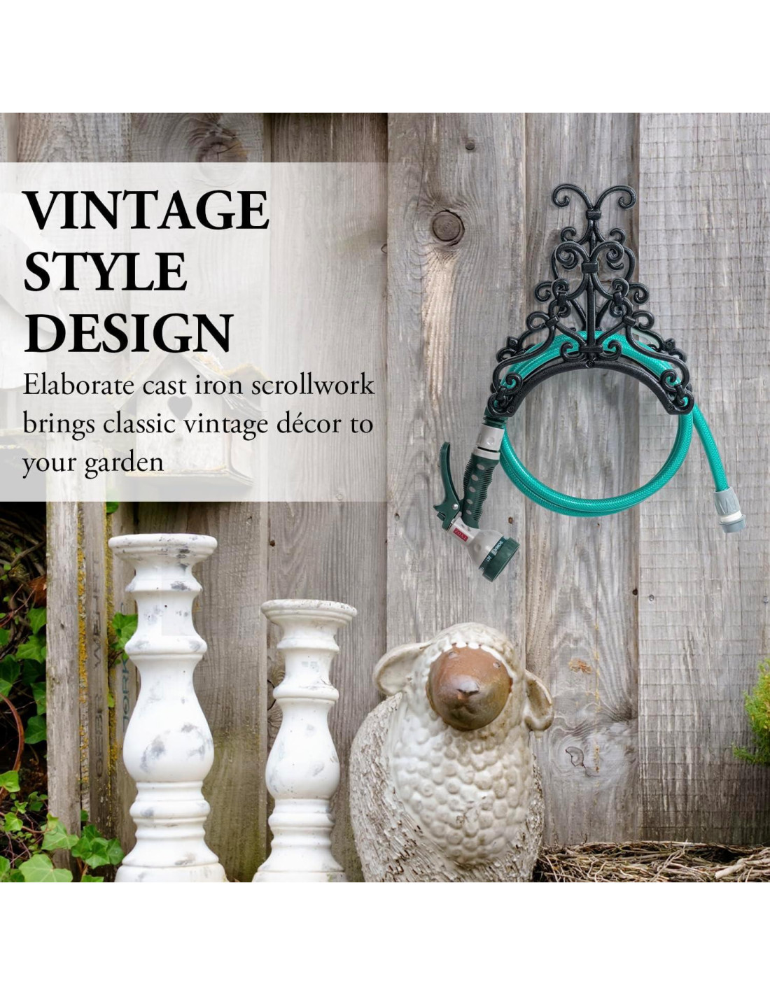 - Gancho de enrollado de manguera de jardinería decorativo de hierro fundido negro con patrón de scroll floral que aporta un toque vintage atemporal a cualquier jardín **Se requiere ensamblaje**