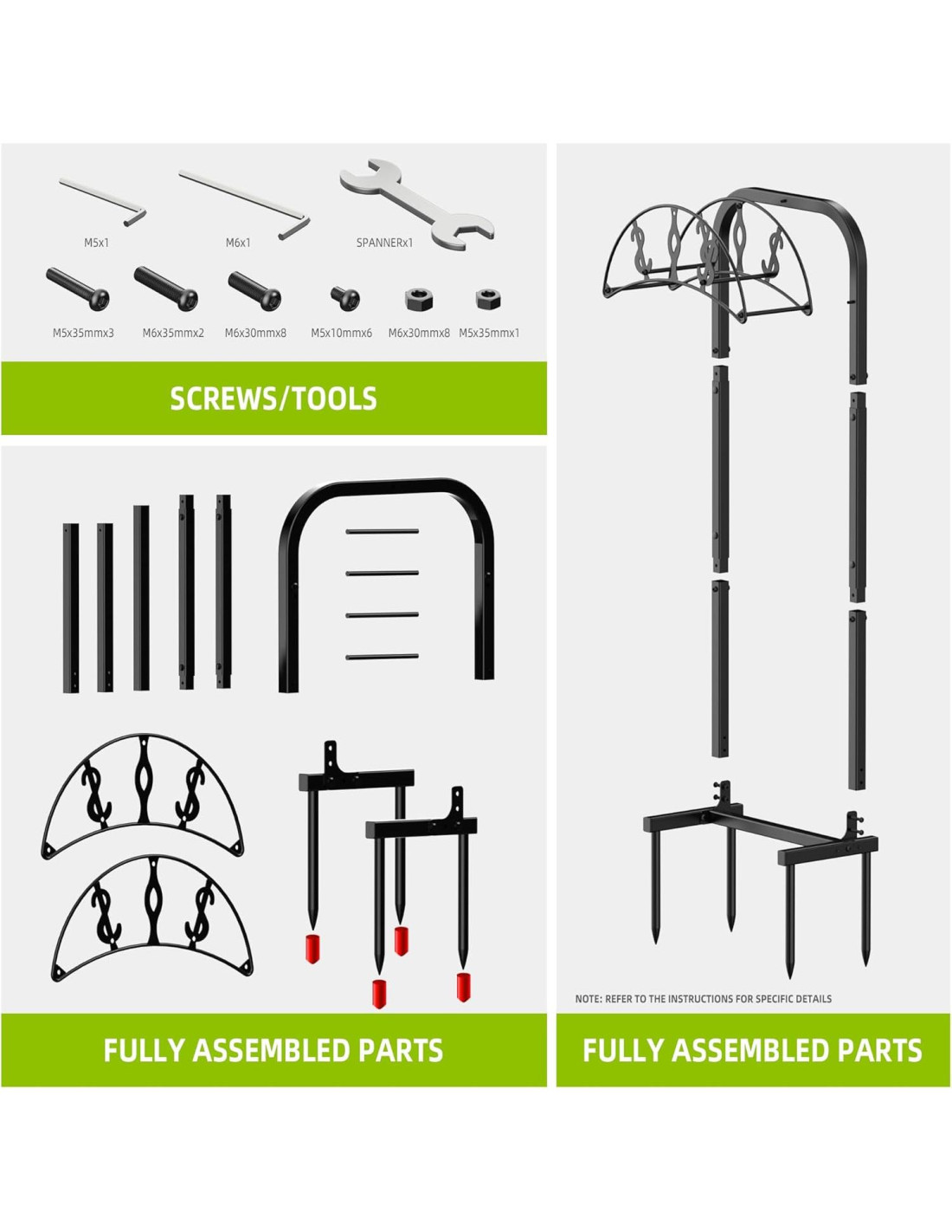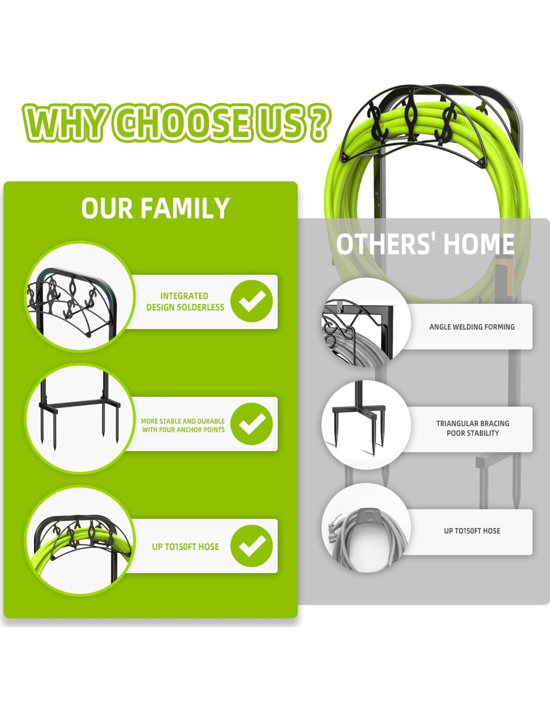 - Picos Mejorados: La base del soporte para manguera de jardín ha sido mejorada a cuatro picos, que son más fuertes y estables que tres picos.
