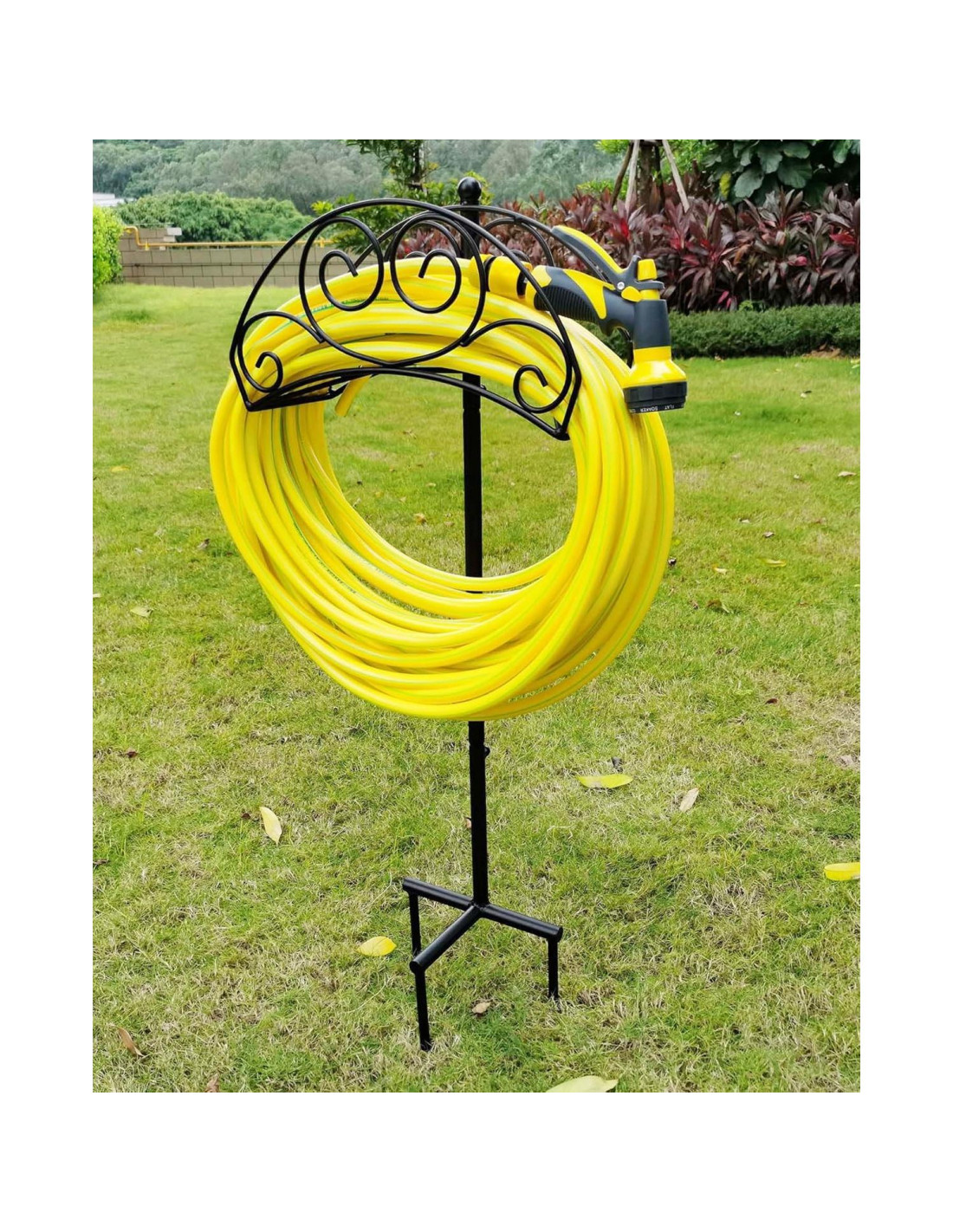 - Necesita ser anclado en el césped/suelo. Los tres puntos de anclaje de este soporte para manguera no son tubos vacíos. Es sólido para estabilidad, una fácil instalación en el césped del jardín.