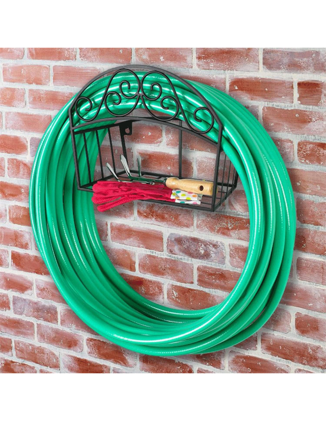 El Soporte Decorativo 241 para Mangueras de Liberty Garden Products proporciona un almacenamiento de mangueras elegante y conveniente. Este soporte cuenta con una construcción de tubos soldados con recubrimiento en polvo y un acabado negro, además de un estante de almacenamiento conveniente para herramientas de jardín de uso frecuente. El diseño simple complementa toda la decoración exterior. Este soporte para mangueras sostiene hasta 38.1 metros de manguera de 1.6 cm (manguera no incluida). Montado en la pared, fácil de instalar (herrajes no incluidos).