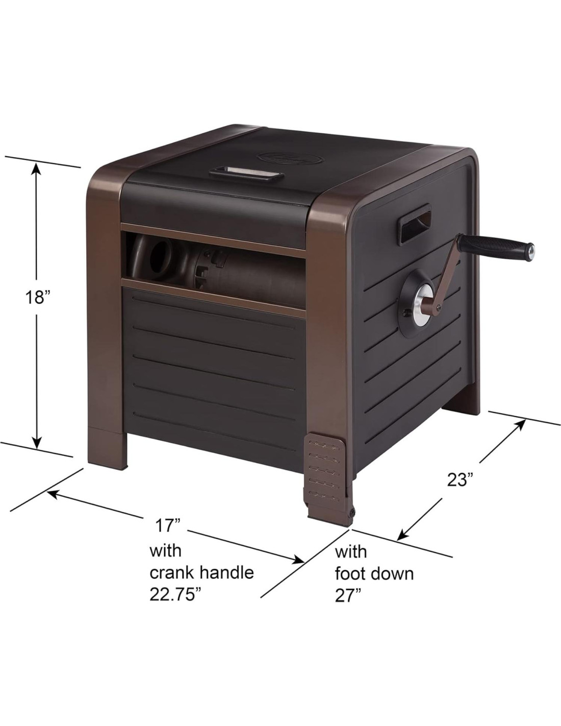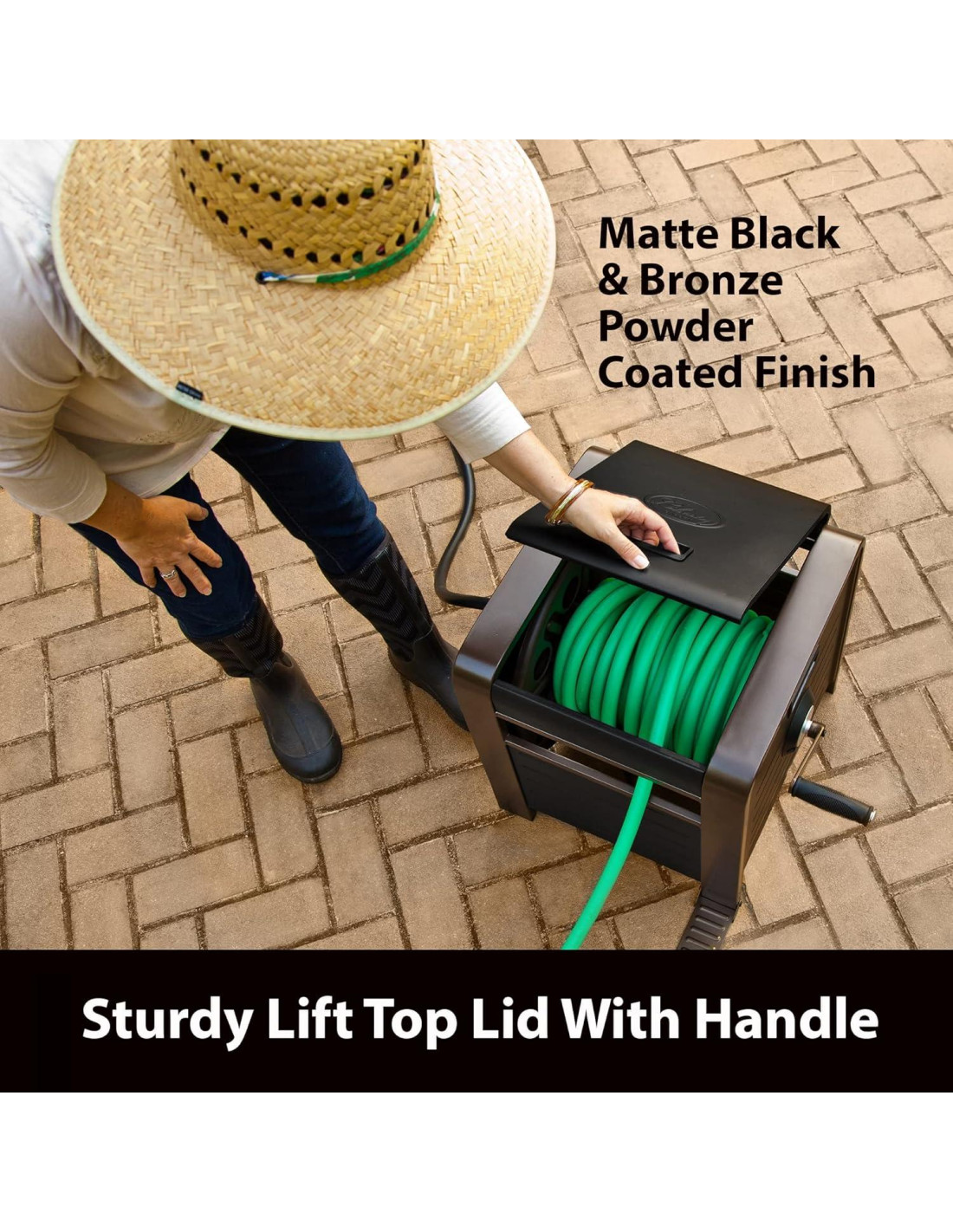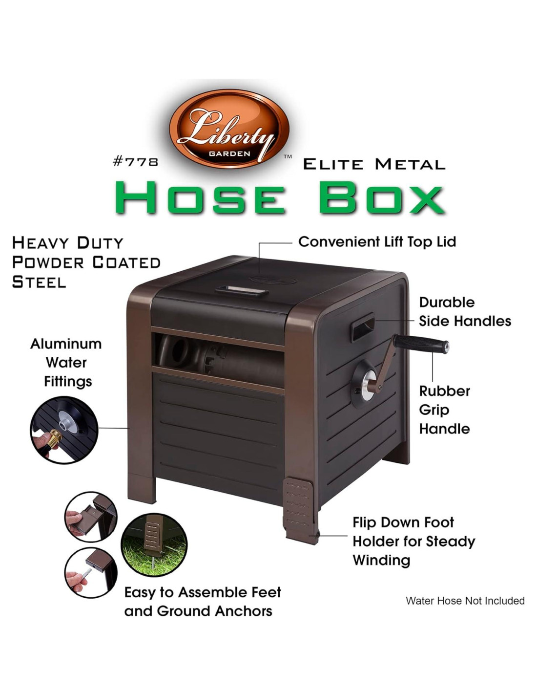 La Carrete de Manguera Elite de Liberty Garden almacena de manera ordenada y fácil tu manguera de jardín. Sostiene convenientemente hasta 200 pies (60,96 m) de manguera de jardín de 5/8" y incluye una manguera de conexión de 5 pies (1,52 m). La caja de manguera Elite de Liberty complementa la mayoría de la decoración y puede ser colocada en tu patio o césped. Cuenta con un pie de paso y picos de tierra para montar de manera segura la unidad y mantenerla estacionaria mientras enrollas y desenrollas tu manguera de jardín.