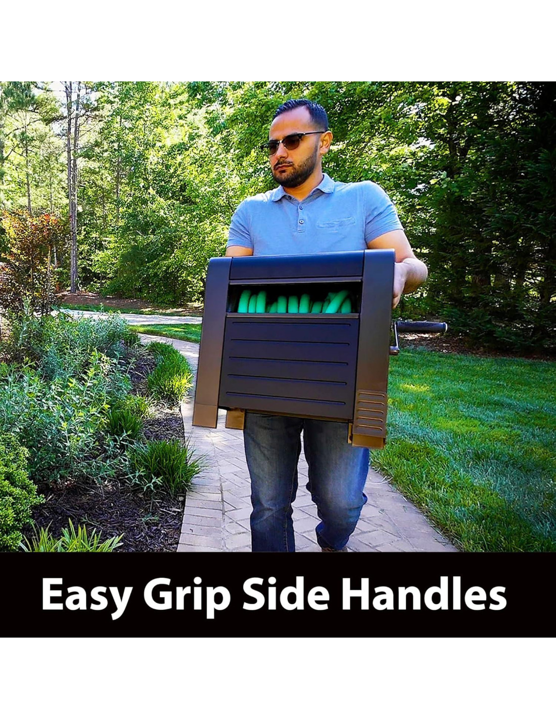 - Mango de carrete de goma suave, paso de caja de manguera plegable y picos de tierra opcionales para un fácil enrollado de la manguera de jardín