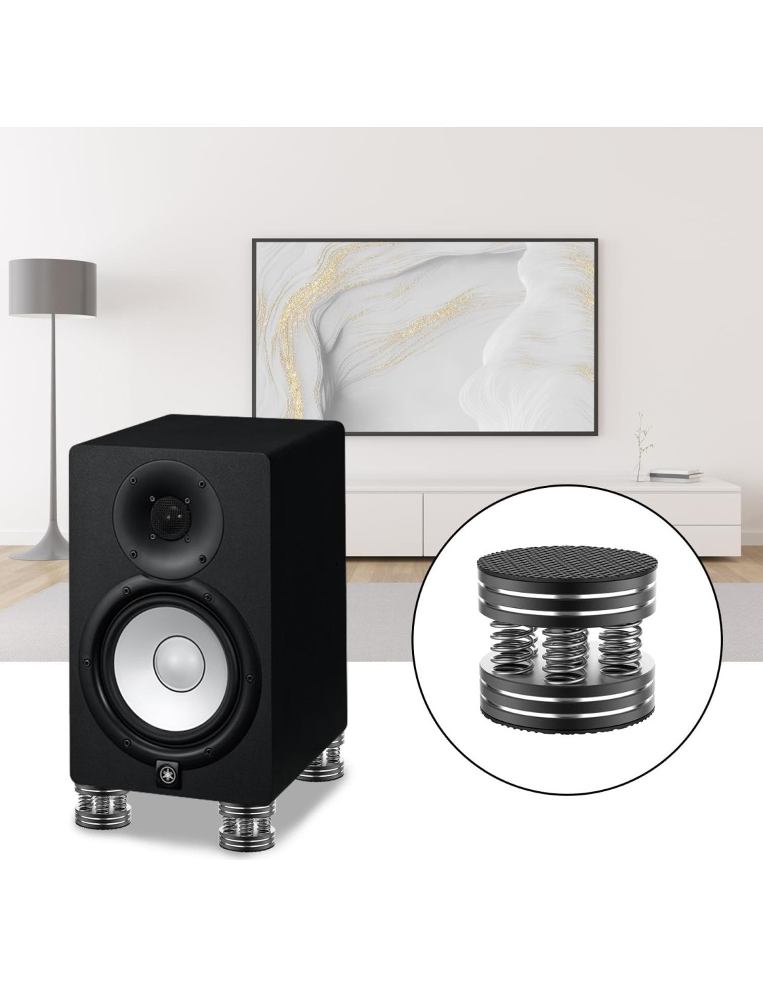- 2. Diseño Integrado de Aleación de Aluminio: Nuestras patas de aislamiento de altavoces cuentan con un diseño integrado que combina aleación de aluminio y resortes, ofreciendo una combinación única de eliminación de vibraciones y efectos de amortiguación. La aleación de aluminio en sí ayuda a eliminar una parte significativa de las vibraciones, mientras que las vibraciones restantes son absorbidas por los resortes, resultando en un rendimiento hi-fi mejorado. Experimenta la magia de este material versátil y eleva tu equipo de música a nuevas alturas.