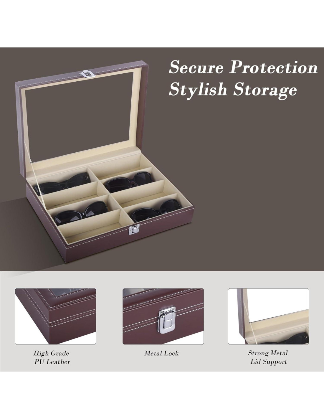 - Superficie de cuero PU de alta calidad marrón, 8 compartimentos separados para mantener tus gafas de sol y gafas organizadas