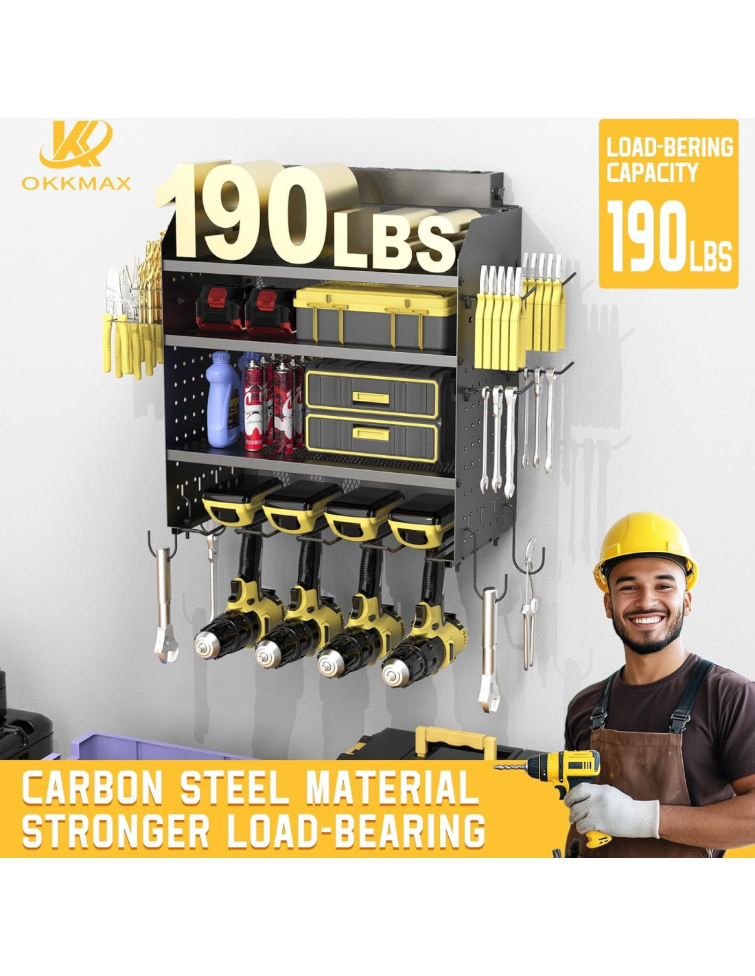 - Almacenamiento Eficiente de 4 Capas: Este organizador de herramientas eléctricas con estación de carga tiene almacenamiento de 4 capas y viene con 4 soportes para taladro, 8 ganchos y 1 panel de clavijas lateral, proporcionando amplio almacenamiento para taladros, baterías, destornilladores y otros accesorios. Este diseño de almacenamiento versátil facilita enormemente el almacenamiento y la recuperación de herramientas, manteniendo tu espacio de trabajo ordenado y eficiente.