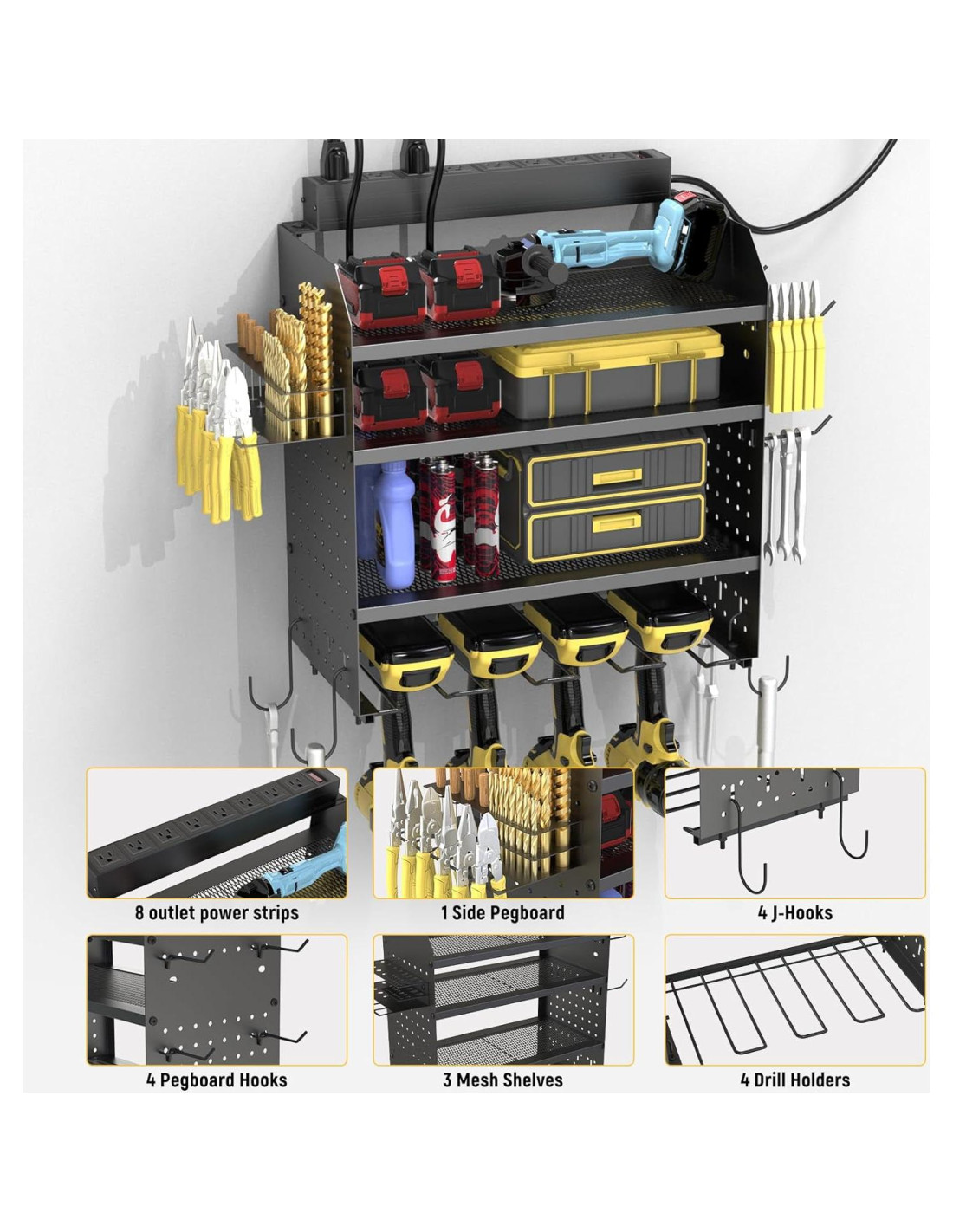 - Componentes incluidos: 1 panel de clavijas, soporte para taladro, 3 tablas de estante, 1 tira de alimentación con 8 salidas de energía, 4 ganchos de panel de clavijas, 4 ganchos en forma de S largos