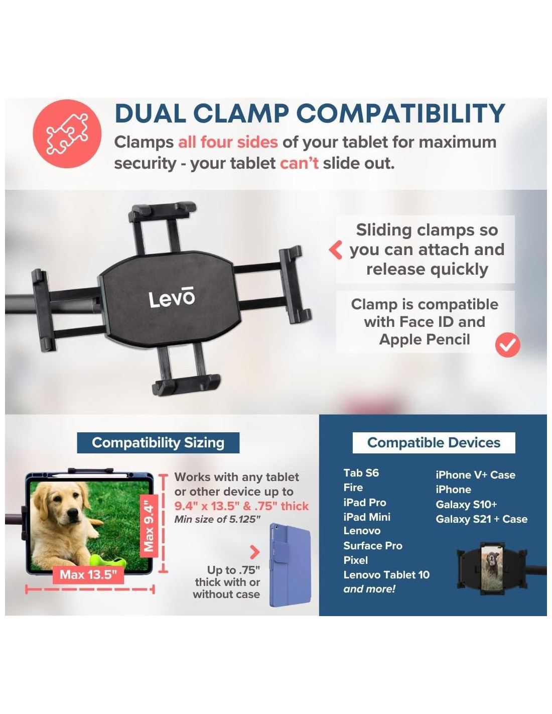 - POSICIONA PERFECTAMENTE tu tableta en total comodidad mientras estás sentado, de pie o reclinado. El brazo horizontal de 15 pulgadas (38.1 cm) se mueve suavemente sobre y entre los pies en forma de V de la base, lo que lo hace ideal para usar en la esquina de sillas o con muebles que ofrecen espacio en la base. Rota, inclina y gira tu tableta a la posición perfecta. Diseñamos este LEVO para que sea ligero pero súper resistente.