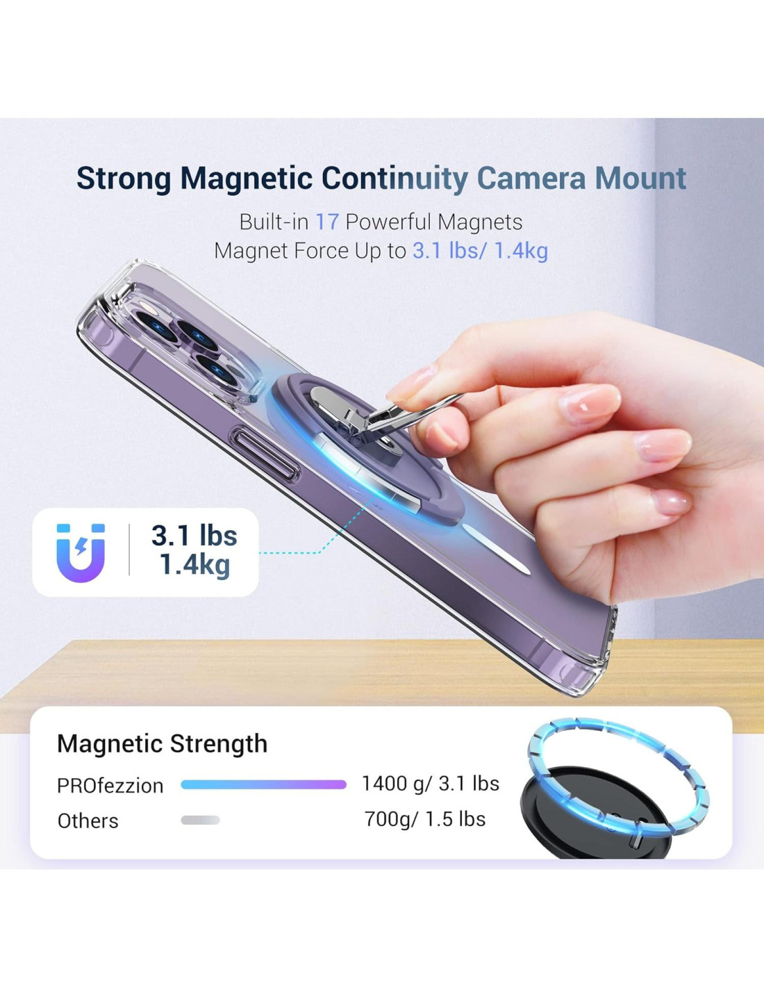 - [Diseño 3-en-1] Se puede usar como un soporte para anillo de teléfono celular, montado en un trípode con tornillos de 1/4"-20, y soporte de cámara de continuidad. El soporte magnético para teléfono es adecuado para la serie iPhone 12/13/14/15/16, compatible con IOS 16 y el sistema MacOS Ventura y versiones superiores.