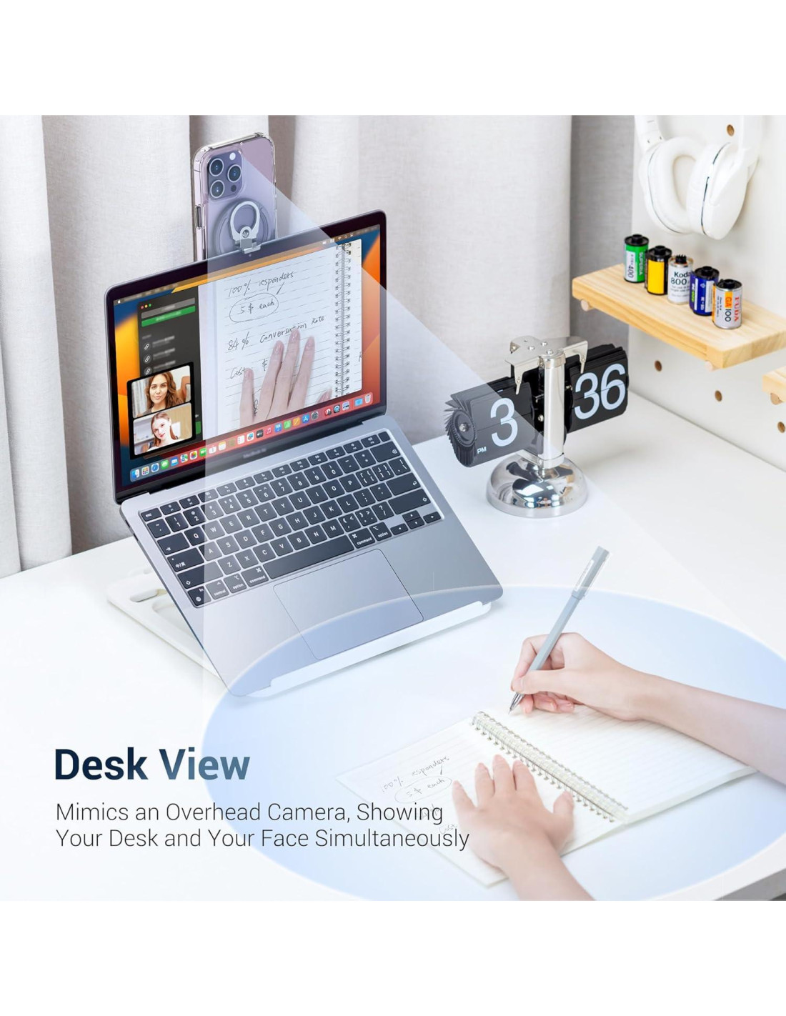 - [Convierte el iPhone en Webcam] Con el soporte de cámara de continuidad, puedes usar la poderosa cámara del iPhone como una webcam para MacBook, y aprovechar la última versión de la función de cámaras de continuidad de macOS para capturar contenido, vista de escritorio y atenuar el fondo mientras iluminas el rostro del usuario, disfrutando de la ventaja de pantalla dual y aumentando la productividad.