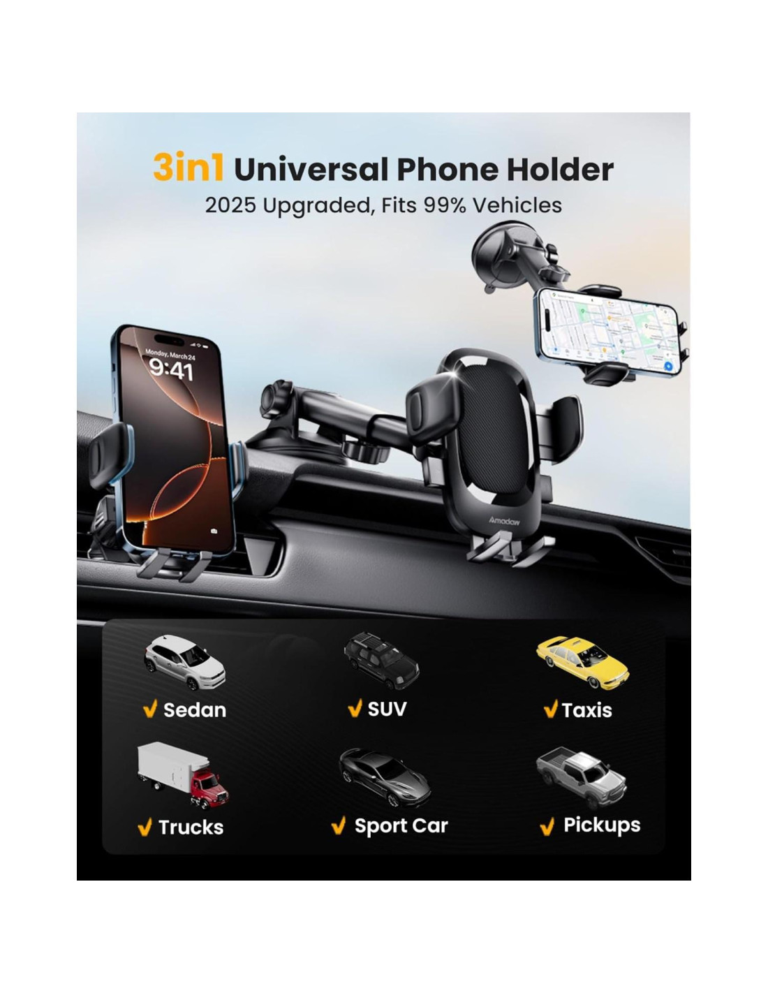 - [Diseño 3-en-1 AMADAW, Compatibilidad Universal]: El Soporte para Teléfono de Coche AMADAW 3-en-1 garantiza una instalación segura y flexible en el tablero, parabrisas o ventilaciones. Adecuado para la mayoría de los modelos de coches, puedes elegir libremente la posición adecuada para instalar.
